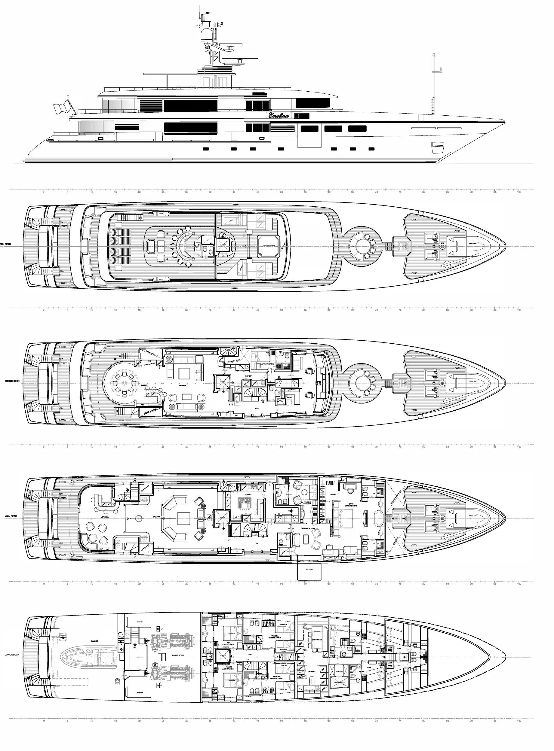 - Elevator through four decks from lower guest cabins to sun deck