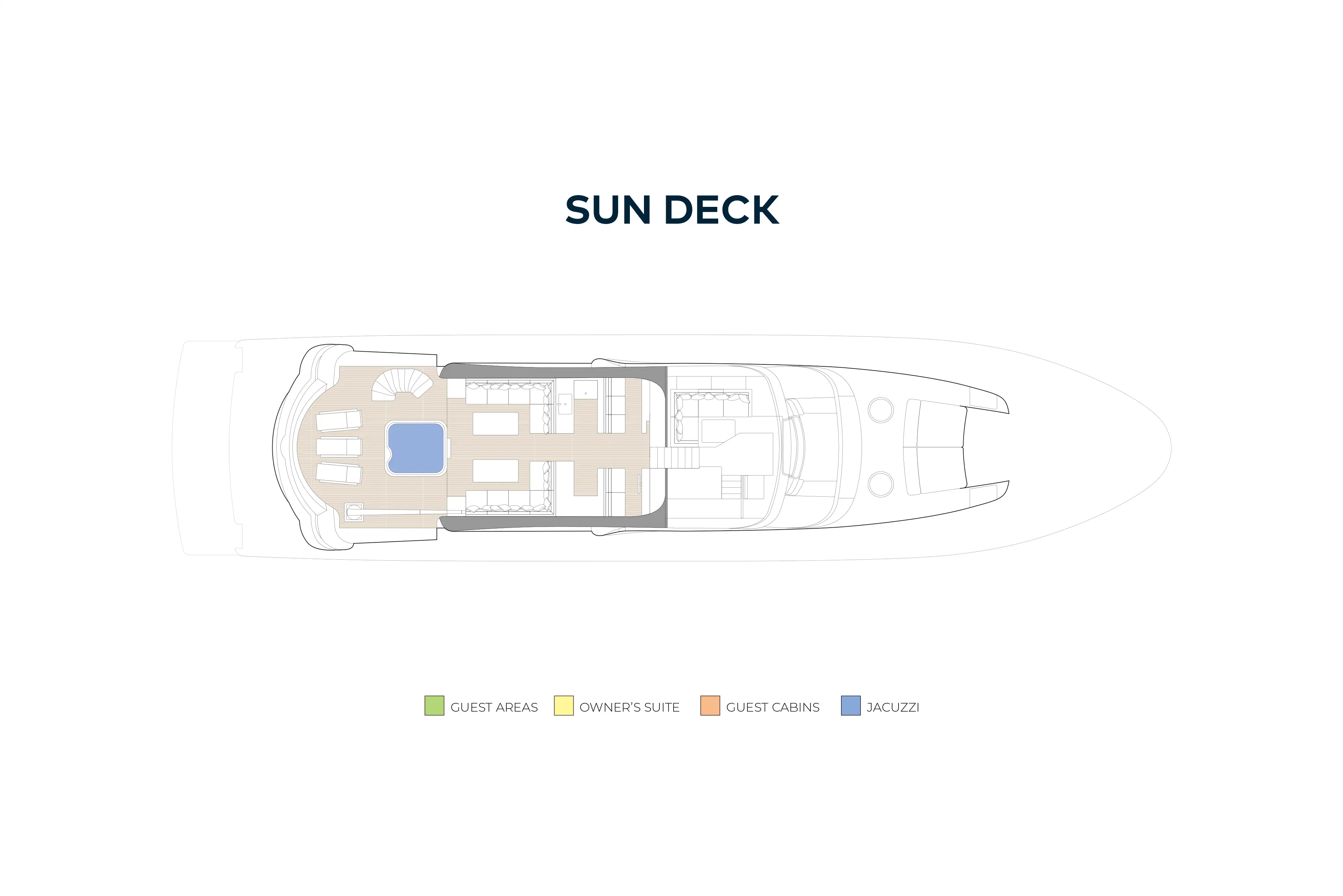 The large sun deck has a deck crane for launching tender and toys, sunlounging deck space and a raised jacuzzi aft, and beneath the hardtop there is L-shaped seating around two tables port and starboard as well as a bar and BBQ. Forward there is forward facing seating to port, a flybridge helm station to starboard and behind a central sliding door are steps leading to the bridge, which has guest seating.