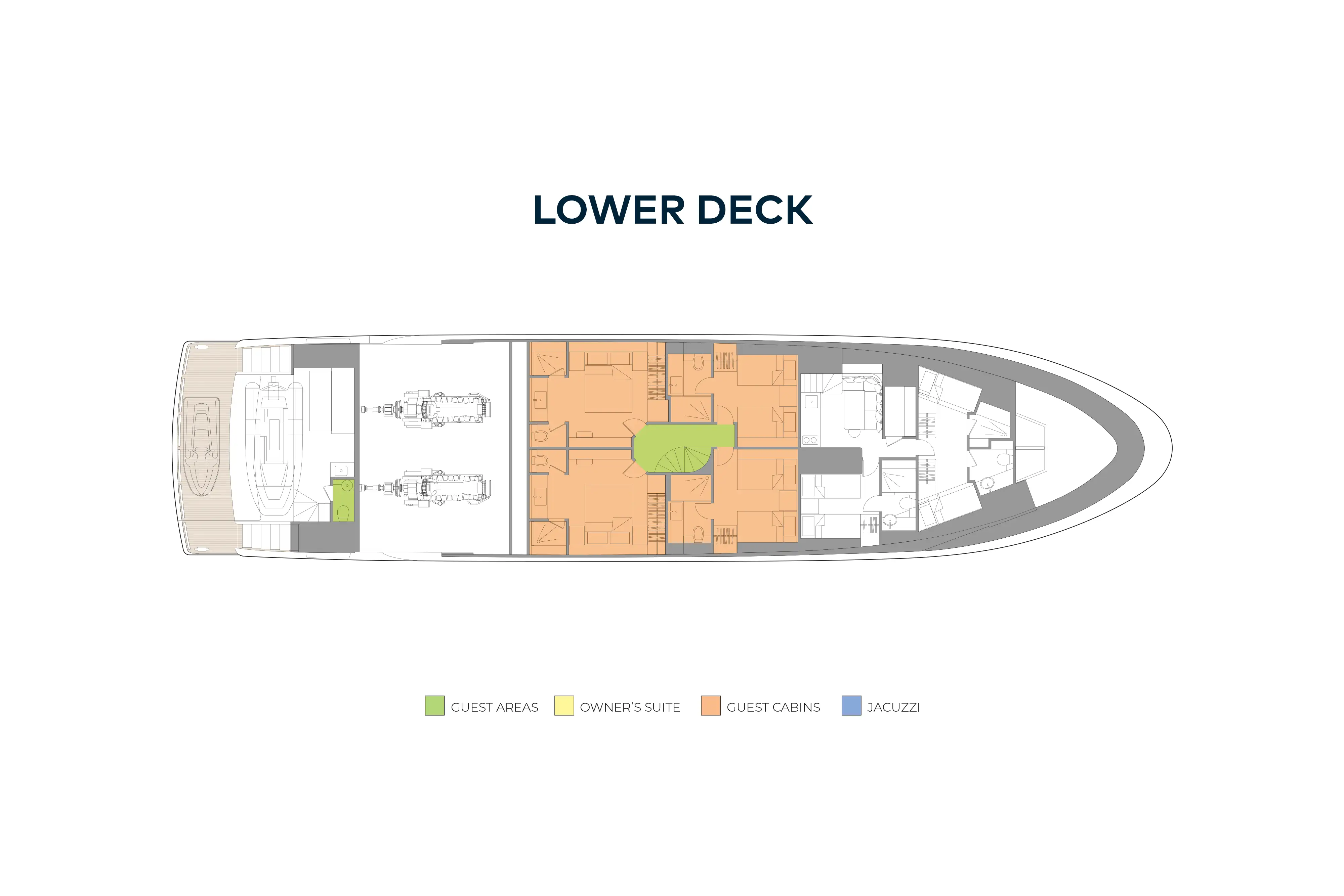 The owner's suite, forward on the main deck, is well lit through large windows port and starboard and two circular skylights. There is a walk-in wardrobe and steps forward lead down to a marble bathroom with shower and bath. On the lower deck are two double guest suites and two twin guest suites, both of which have an additional berth, completing accommodation for 12 guests in five suites.