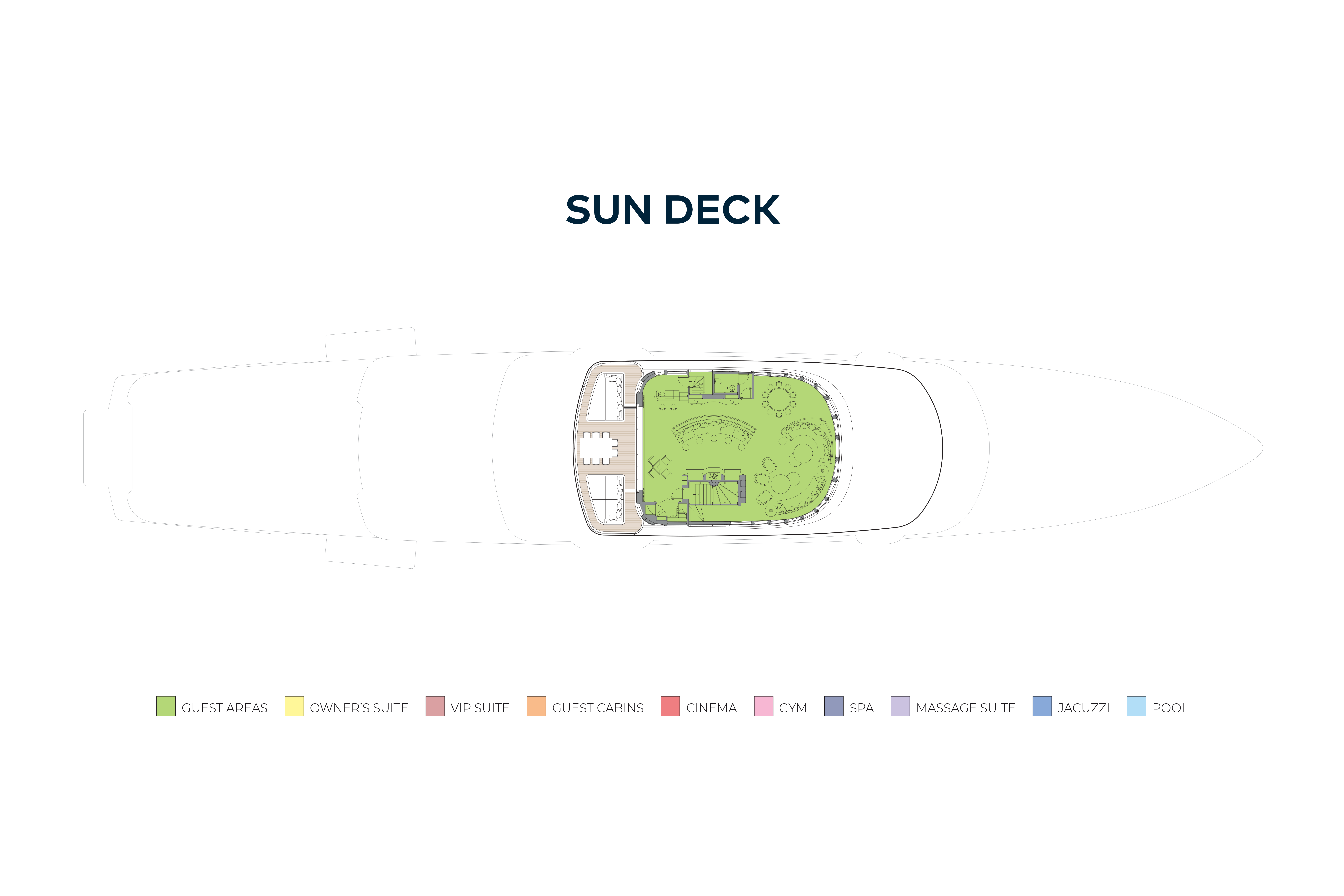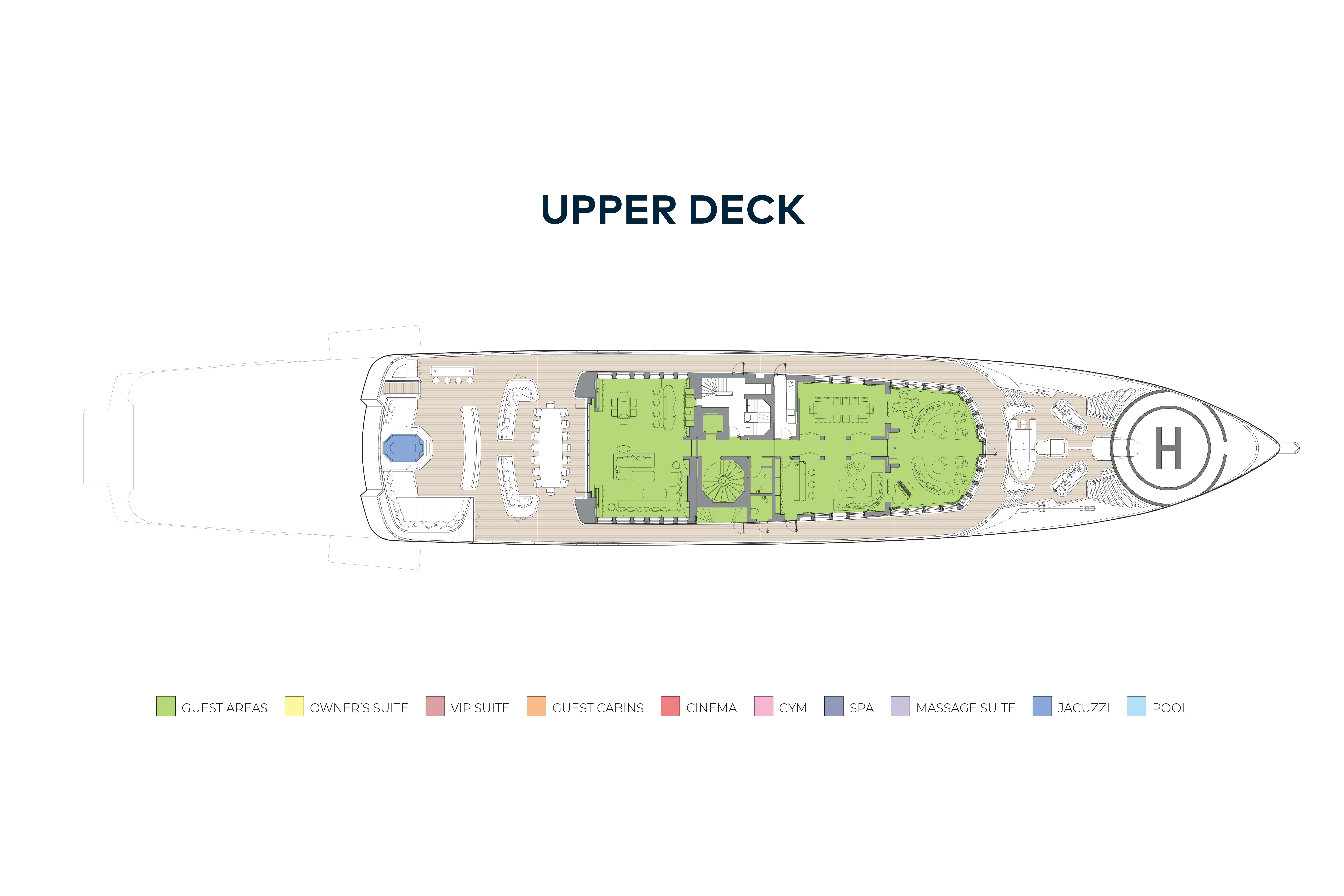 The upper deck is all about entertainment. On the aft deck is a sit-up bar, open air dining for 16 guests and banquette seating, as well as a jacuzzi and sunpads aft. Walkaround sidedecks lead forward to the touch-and-go foredeck helipad, which could also serve as an entertainment space or sun lounge. Inside the sky lounge has lounge seating and a sit-up bar, there is an observation lounge with wraparound views and a baby grand piano forward, as well as a formal dining room and a second, more intimate lounge.