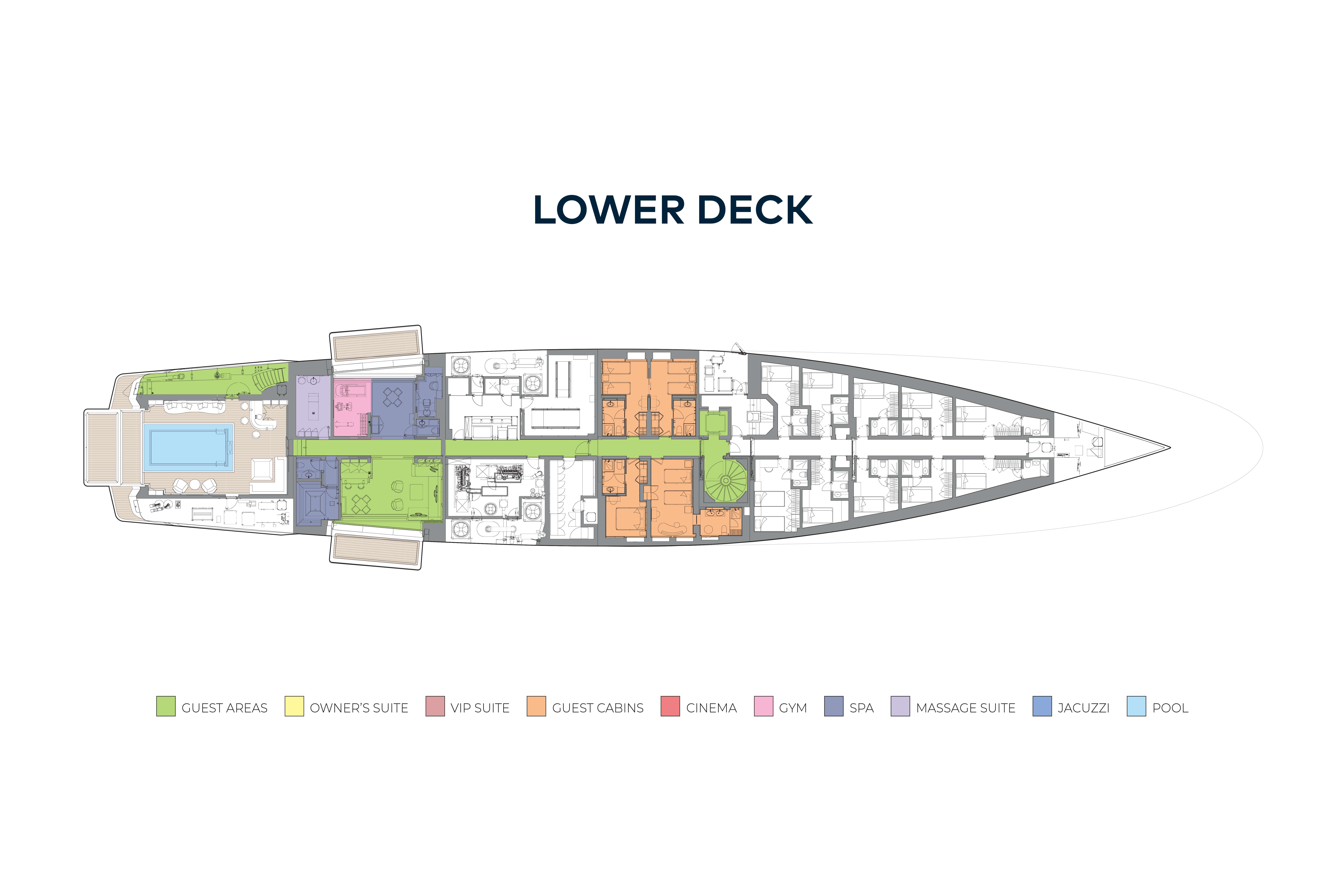 On the bridge deck, the owner's suite is aft facing with his-and-hers en suite, walk-in wardrobe and access to the jacuzzi and sunpads on the aft terrace. Walkaround sidedecks lead forward either side to seating forward of the bridge. Also on the upper deck are two children's cabins that could also serve as staff cabins. These complete accommodation for up to 24 guests in 12 cabins.