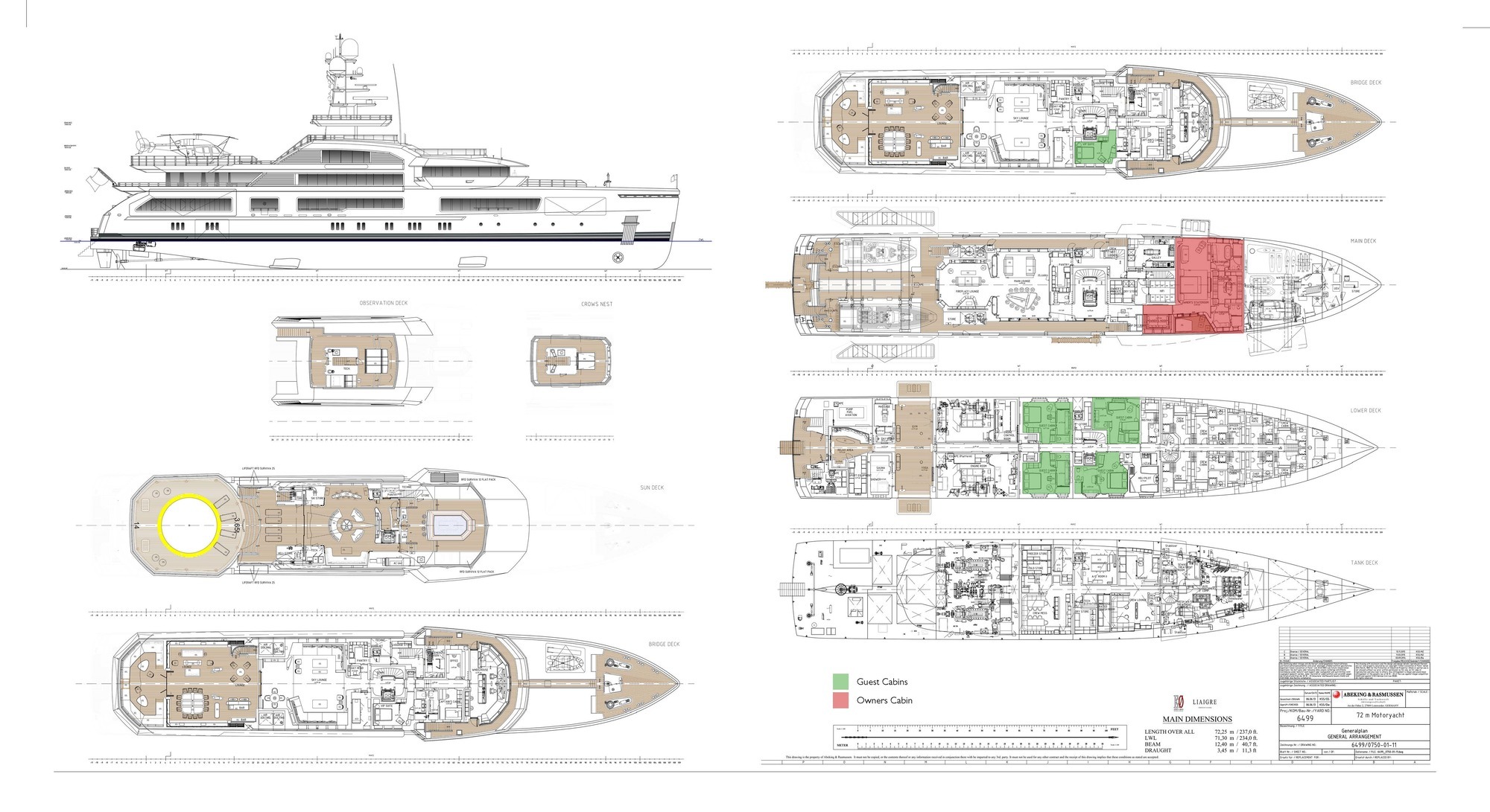 The sun deck offers a large pool with sun loungers, another inviting lounge with smart leather sofas to enjoy evening cocktails and a large cinema screen for movie nights. The helipad aft can be converted into a dance floor with complete sound and light system, while the top observation deck is a more intimate area for a quiet nightcap with a view.