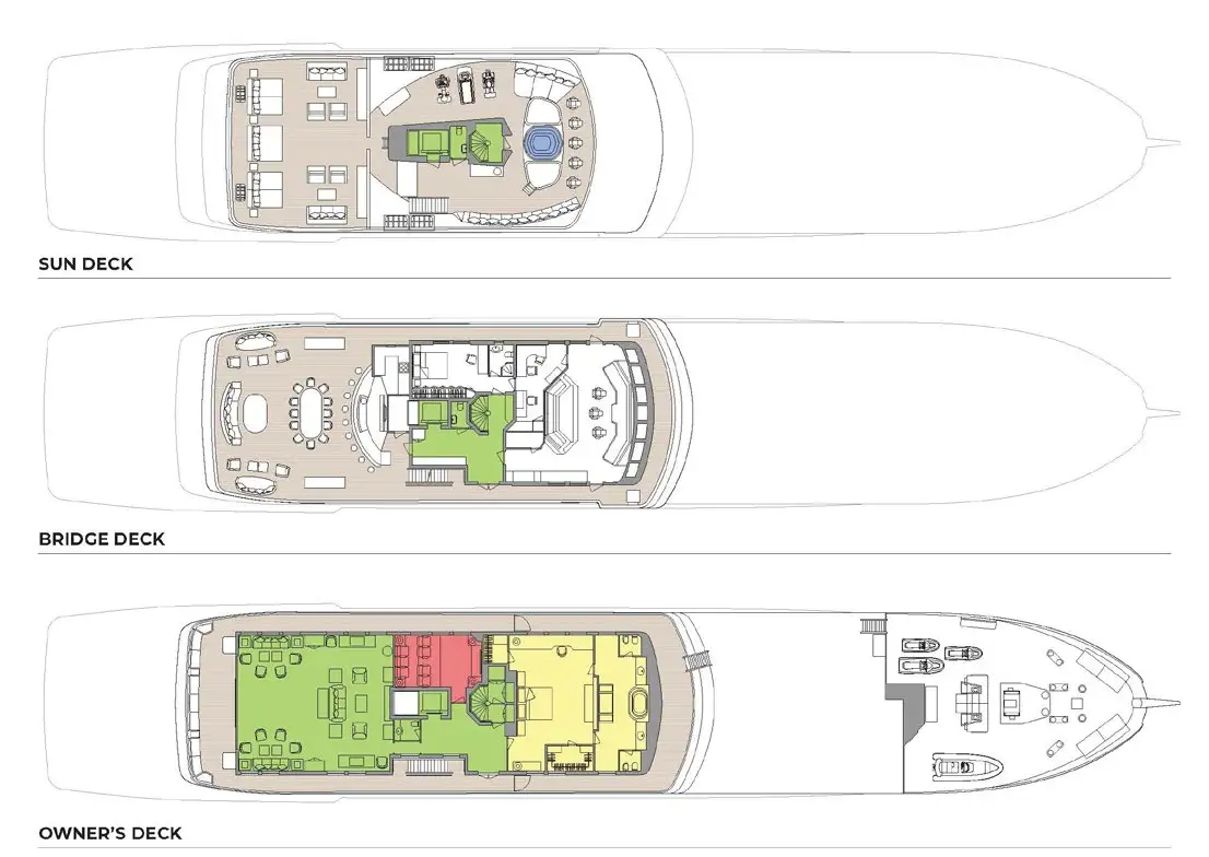 The key features of this amazing vessel include what is believed to be the largest and most comprehensively equipped spa/wellness centre on any private yacht available for charter, staffed by a professional beautician and masseuse. There’s also a large gym, a high-end movie theatre and an outdoor saloon large enough to seat up to 60 diners, which converts into a disco deck with a professional-spec DJ booth, sound system and dance floor. An elevator links the main deck with the sundeck and all other decks in between.