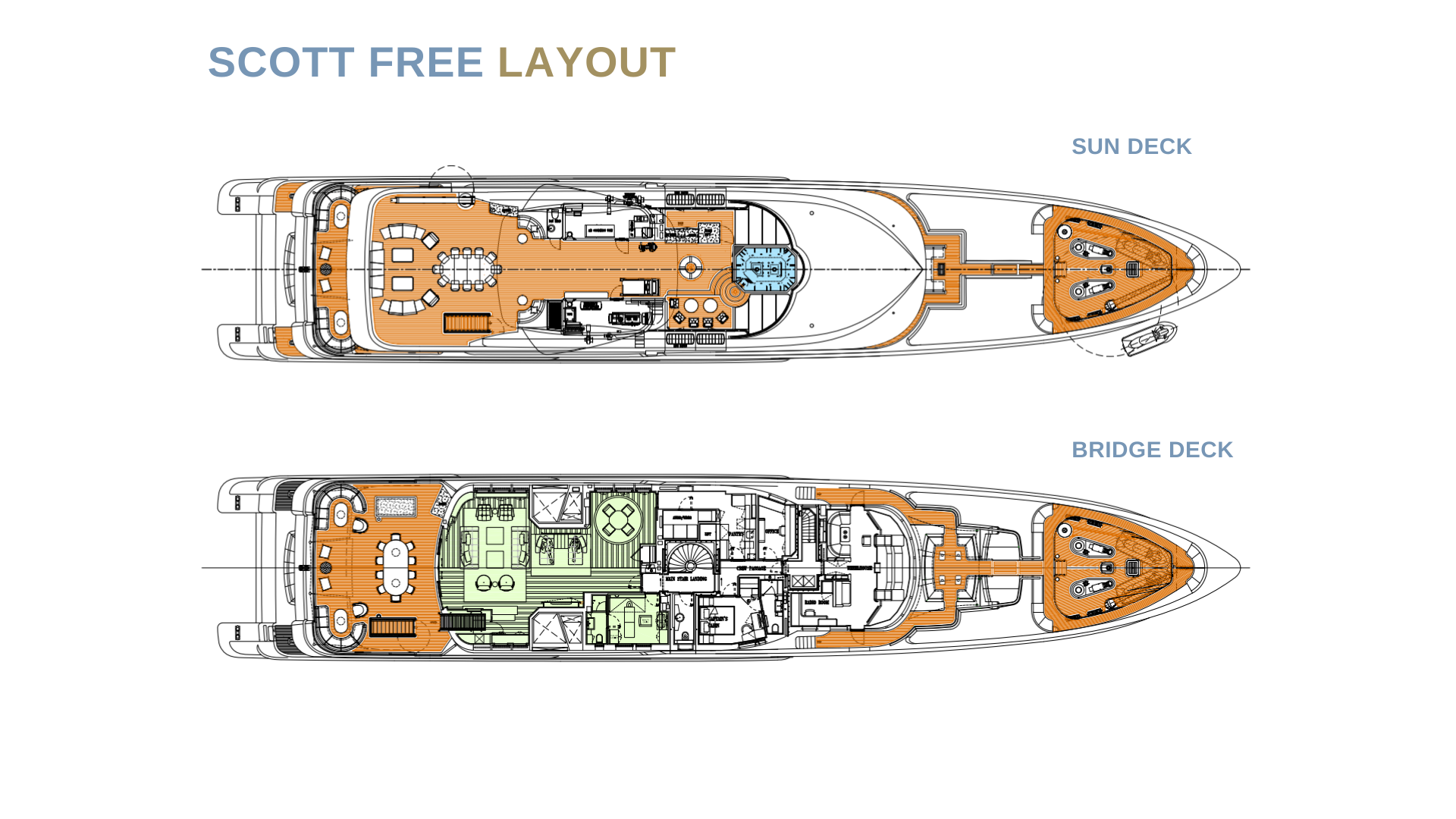 Having completed a circumnavigation of the world under her first ownership, SCOTT FREE is now a proven and highly regarded charter yacht and has been maintained to the very highest standards. She offers a highly flexible accommodation layout with master suite on the main deck, and four guest cabins on the lower deck (two king size beds, two queen beds which can also be set up as twins), and one multipurpose cabin on the bridge deck with two pullman berths. The four lower deck guest cabins are also interlinked so can be set up as two full beam VIP suites complete with lounge area.