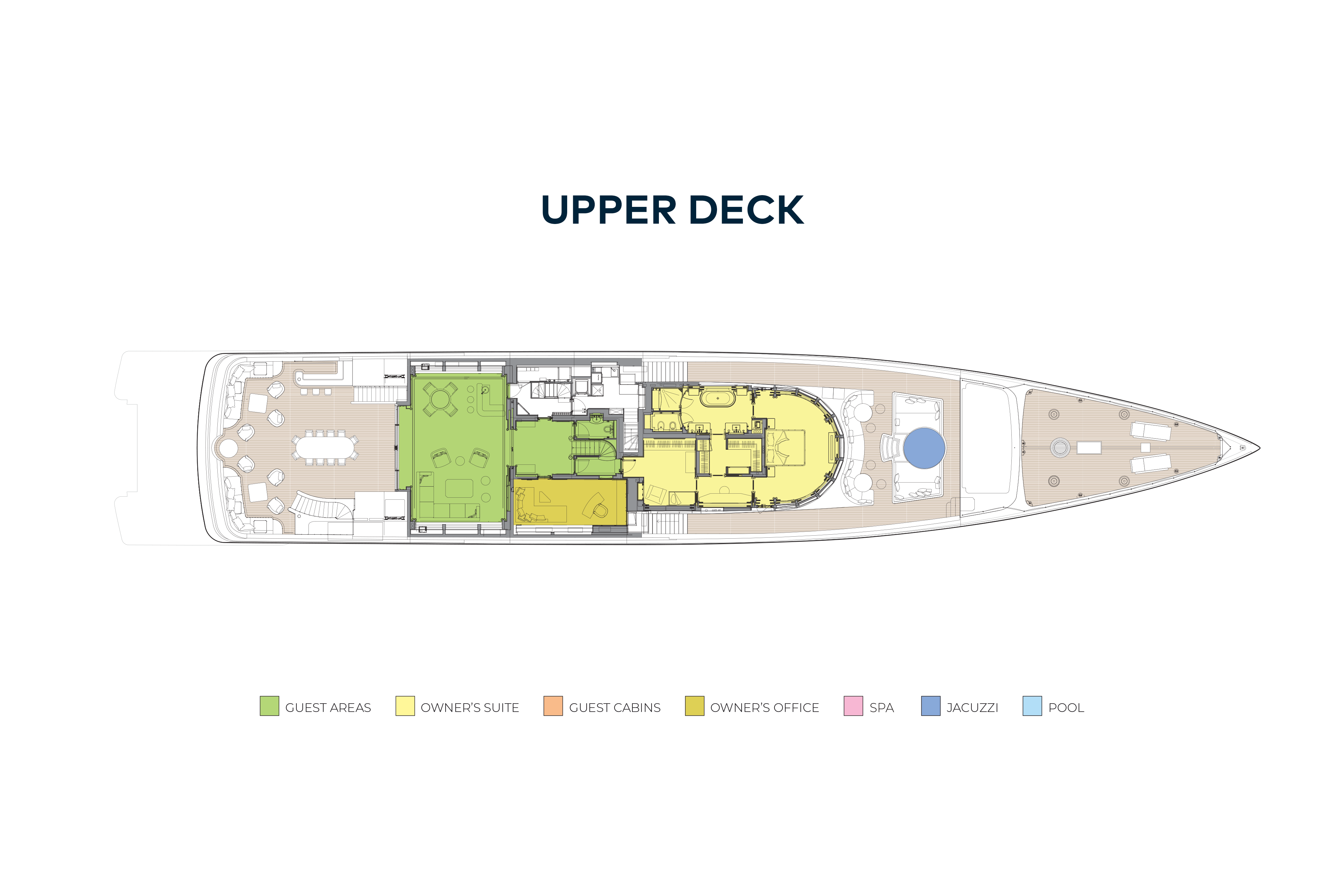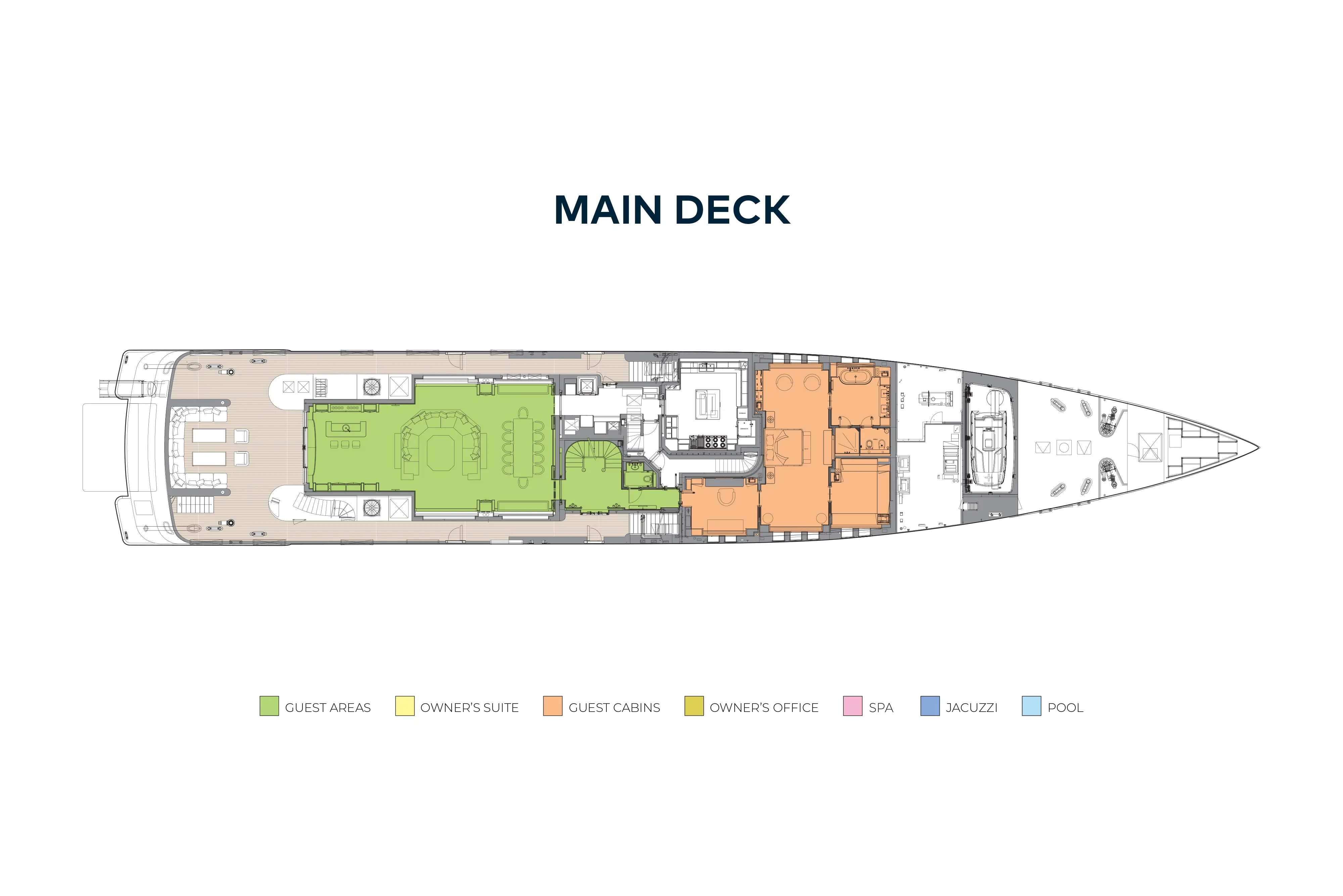 The exteriors are extremely well designed, offering a variety of areas to enjoy throughout the day: a split-level sundeck with large jacuzzi pool, bar, seating and sunbathing, dining on the upper deck aft and a very welcoming exterior lounge on the main deck aft.