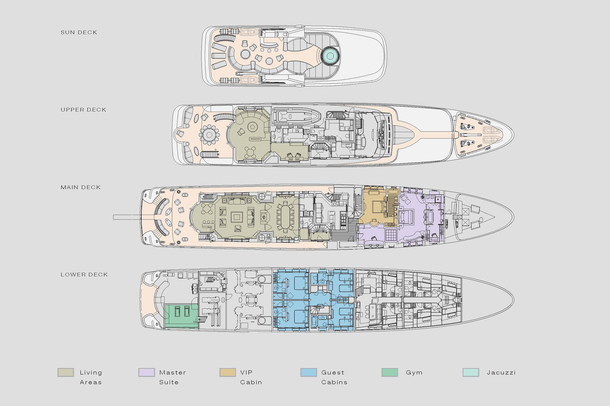 - Master and VIP cabins on the main deck