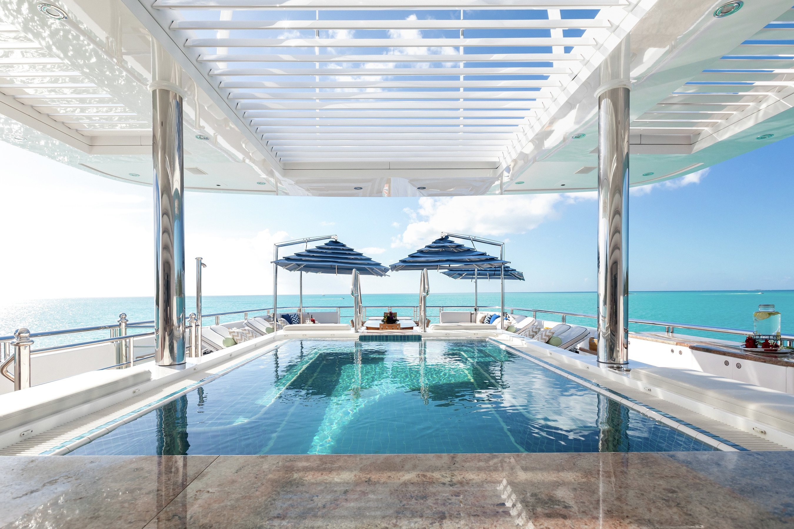 Large sun deck with bar and jacuzzi, plenty of watertoys for entertainment