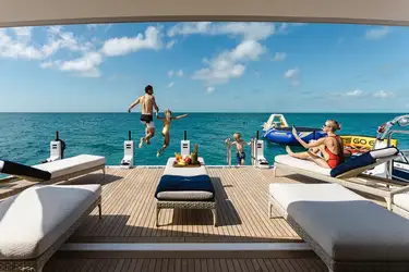 With two master suites, an elevator to all decks, inflatable climbing wall and amazing beach set-up - no one will want to go home at the end of the charter