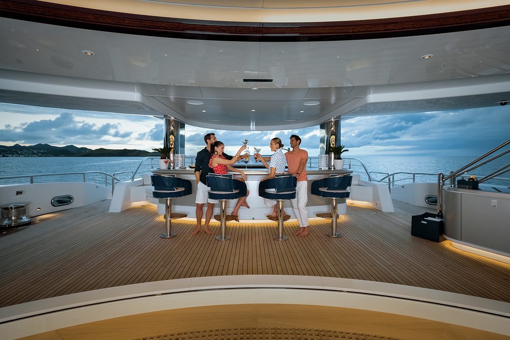 Whether celebrating, drinking sunset cocktails, a pre-dinner drink or watching sports events, the bar on a yacht is generally one of the focal points on board a superyacht. They come in many forms, ranging from wet bars on the sun deck to sit-up bars in the beach club, sky lounge bars and cosy saloon bars, backlit-onyx bars, and elegant marble-top bars.