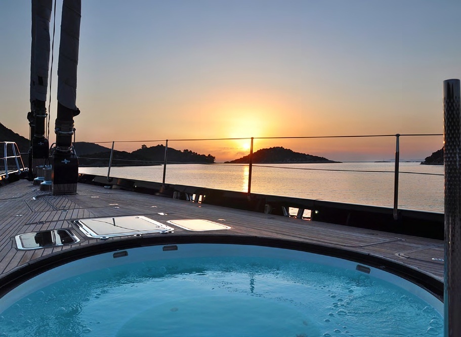 She has a foredeck jacuzzi, which is rare on a sailing yacht, and a shady open-air dining area. Below decks the light, bright climate-controlled lounge is a fantastic living space.