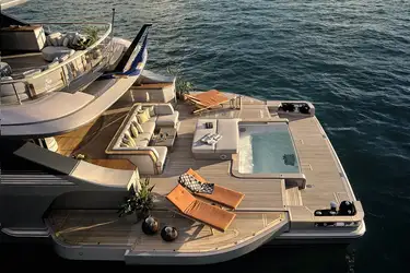 She's full of surprises and offers many features like an extra jacuzzi on the sun deck, as well as a beach club unimpeded by the watertoys and tender hidden away in the side and forward garages. Another bonus in design, construction and engineering is her wheelhouse including a futuristic steering position with panoramic view where captain and guests can enjoy the cruise.