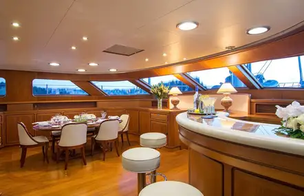 Divided main deck exhibiting large windows, forward dining/bar area and formal saloon