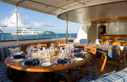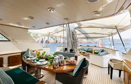 Steps aft of the sun deck lead to the aft bridge deck. This has a formal al fresco dining area and relaxed seating, while glass balustrades give uninterrupted views. Steps lead down to the main deck aft. There is an inside-outside bar at the entrance to the saloon, with sunpads and banquette seating around a table aft. Steps either side lead down to the beach club.