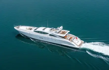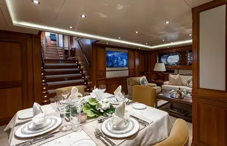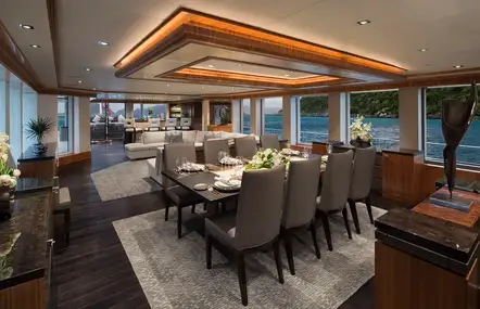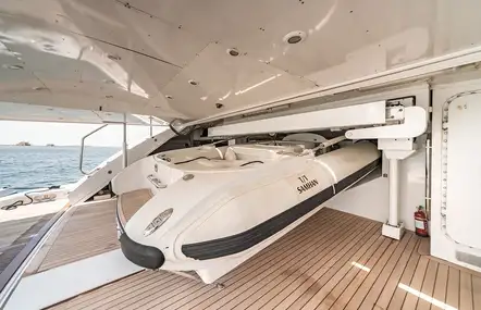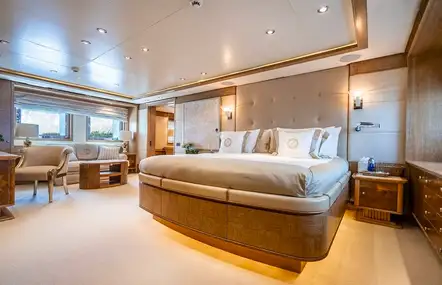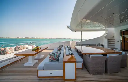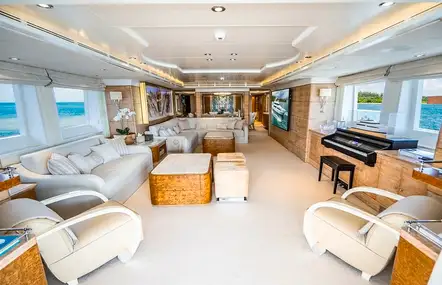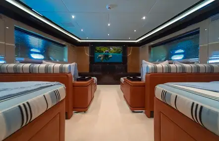 She exhibits bright and warm luxury interiors with several entertainment areas throughout with a sky lounge inclusive of games tables, large TV screen and portside sit-up bar. The multi-use main deck furnished with formal dining and media lounge including a 100 in HD TV for the full cinema experience. Aft deck lounge accessible via sliding glass doors leads down to a swim platform and tender garage, with two of the four tenders being a 9.1m (36ft) Cigarette chase and 5m (16ft) Castoldi jet.
