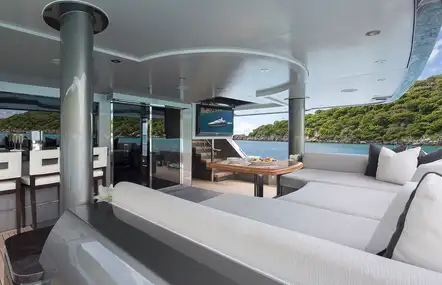 Lounging on the main deck aft with the yacht's inside-outside bar to the left. The transom folds down to reveal the beach club and create a large swim platform