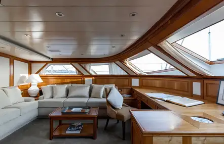 The interior and exterior furnishings have been recovered, all surfaces and marble has been professionally cleaned and coated. The teak decks have also been professionally sanded. No expense has been spared to bring this yacht to market in pristine order for a new owner. On deck, the main cockpit is split into two areas: lounge and dining. Both can comfortably sit up to eight people. Immediately behind the shaded cockpit is a large sunbathing area. Down below, NORFOLK STAR's bright deck saloon has panoramic views. Her interior is finished in cherry wood, and the large hull portholes give the interior a particularly light and airy feel. From the deck saloon steps forward lead to the main saloon and formal dining area.