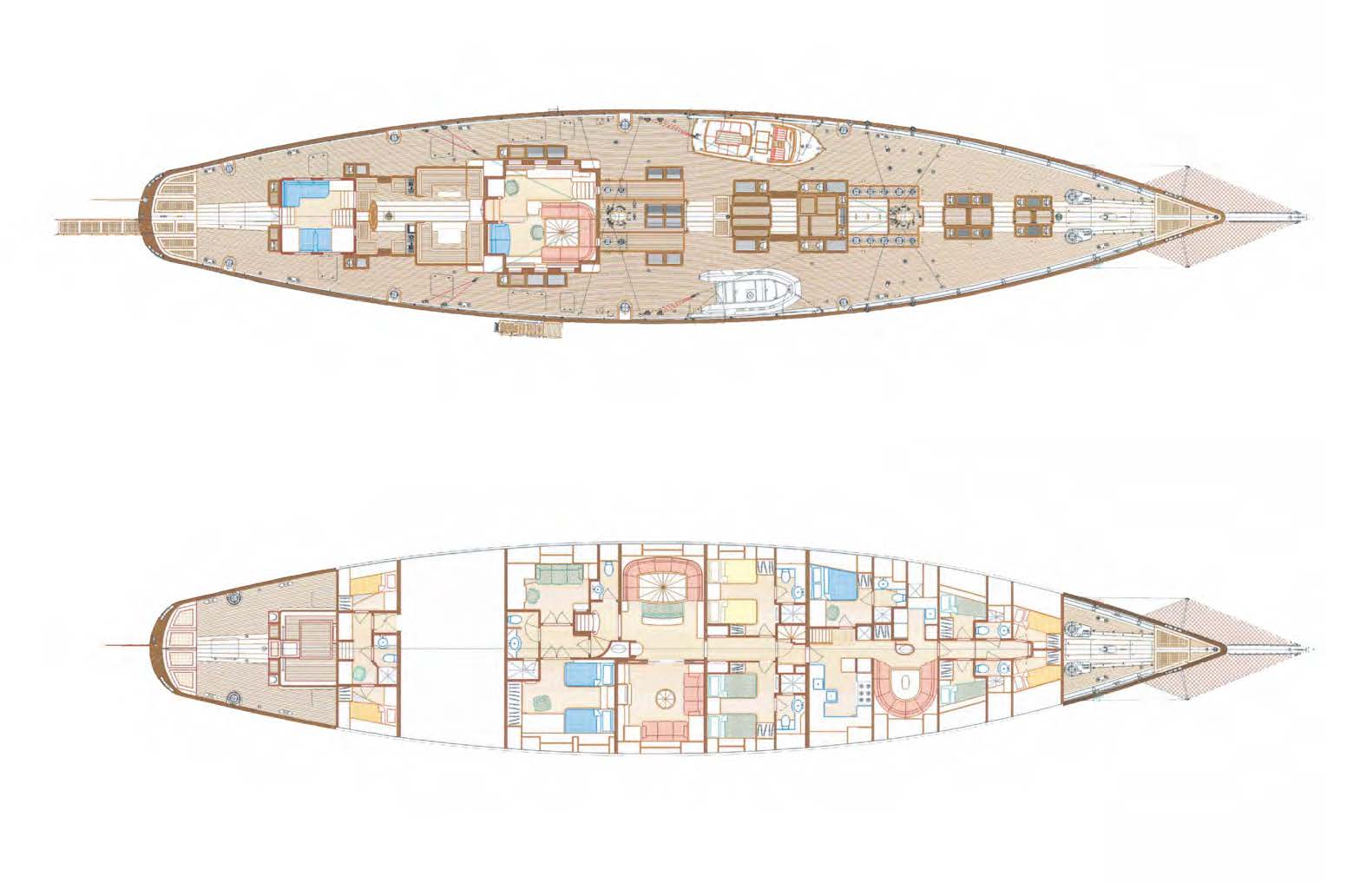 In common with all Alden designs, her sail plan is easily managed by a shorthanded crew but she can also pick up her skirts and fly at speeds into the high teens with a full crew in a regatta. When becalmed her 1,057hp MTU diesel engine gives her a top speed of 12.5 knots and a range of 3,200nm at her cruising speed of 10 knots.