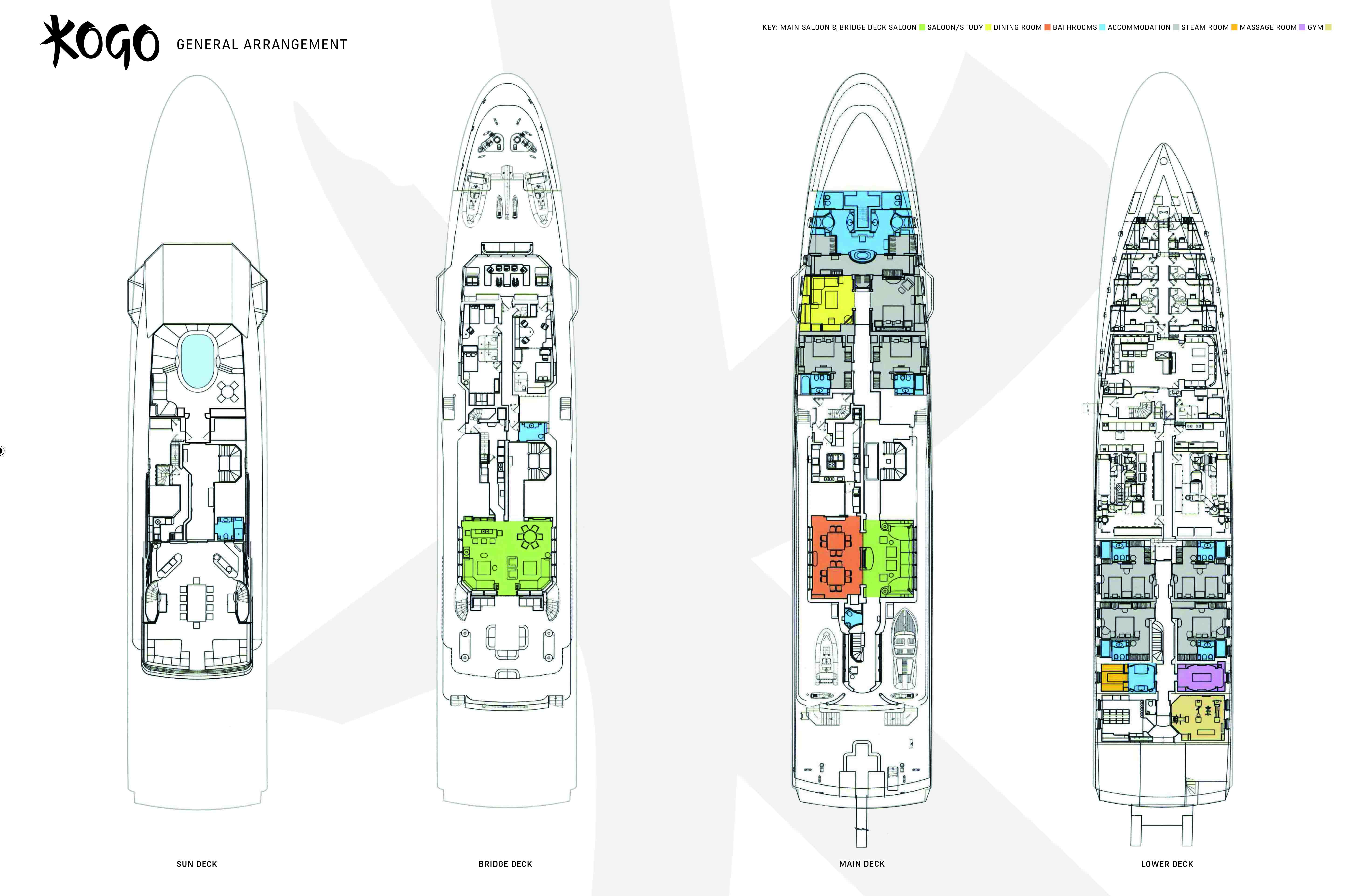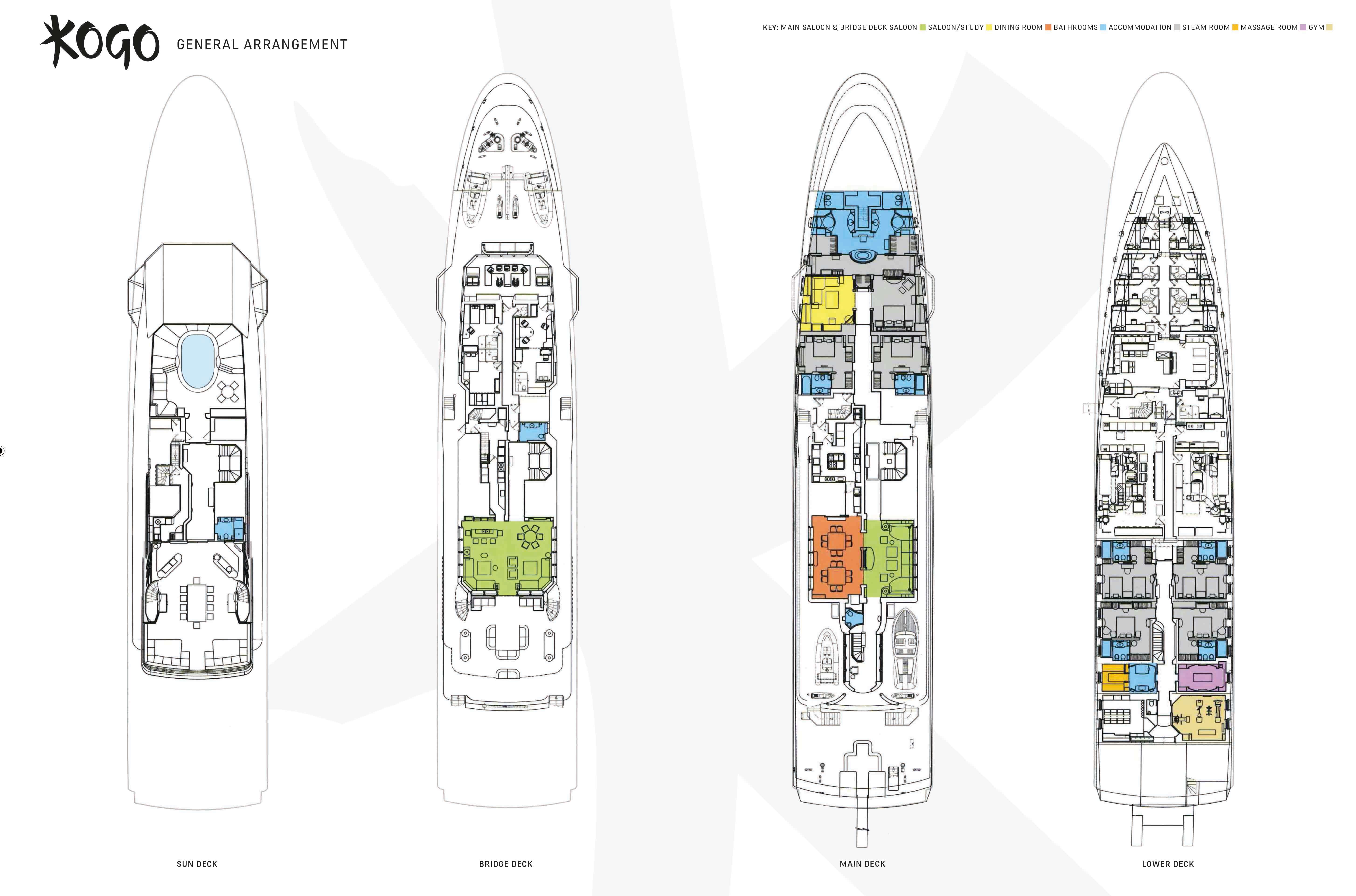 Disdale describes KOGO’s interiors as ‘clean modern lines with a Zen influence’ and there is a calming aura of balance on board as one descends to the lower deck, where guests can work out in a well-equipped gym, sweat it out in a steam room, freshen up in a shower room before enjoying a soothing rub down in the massage room.