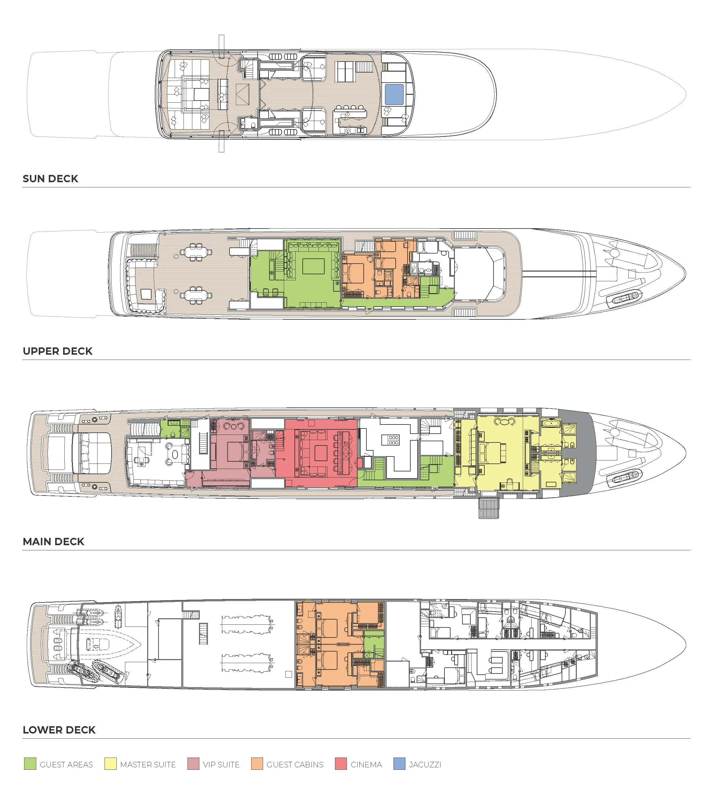 Her sun deck was widened by moving funnels outboard and covered by a new 35sqm (376.7sqft) hardtop. Teak decking was replaced, a Villery & Boch jacuzzi was installed along with a 25sqm (269.1sqft) fully equipped bar. A dayhead with shower was added, jetski deck cranes were removed and nightclub-standard lighting, smoke and sound systems were fitted.