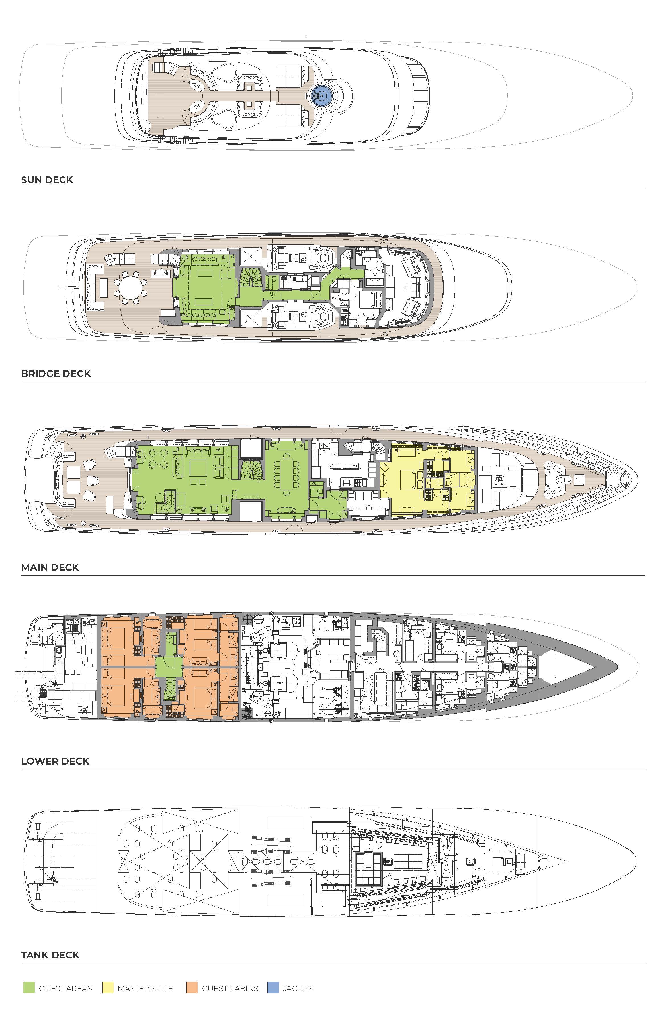 The exterior decks offer a range of lounges, with the sun deck offering several options for sunbathing alone. Both the main and bridge deck offer lounge areas, while the bridge deck is also suited for al fresco dining and features an open air gym on the port side.