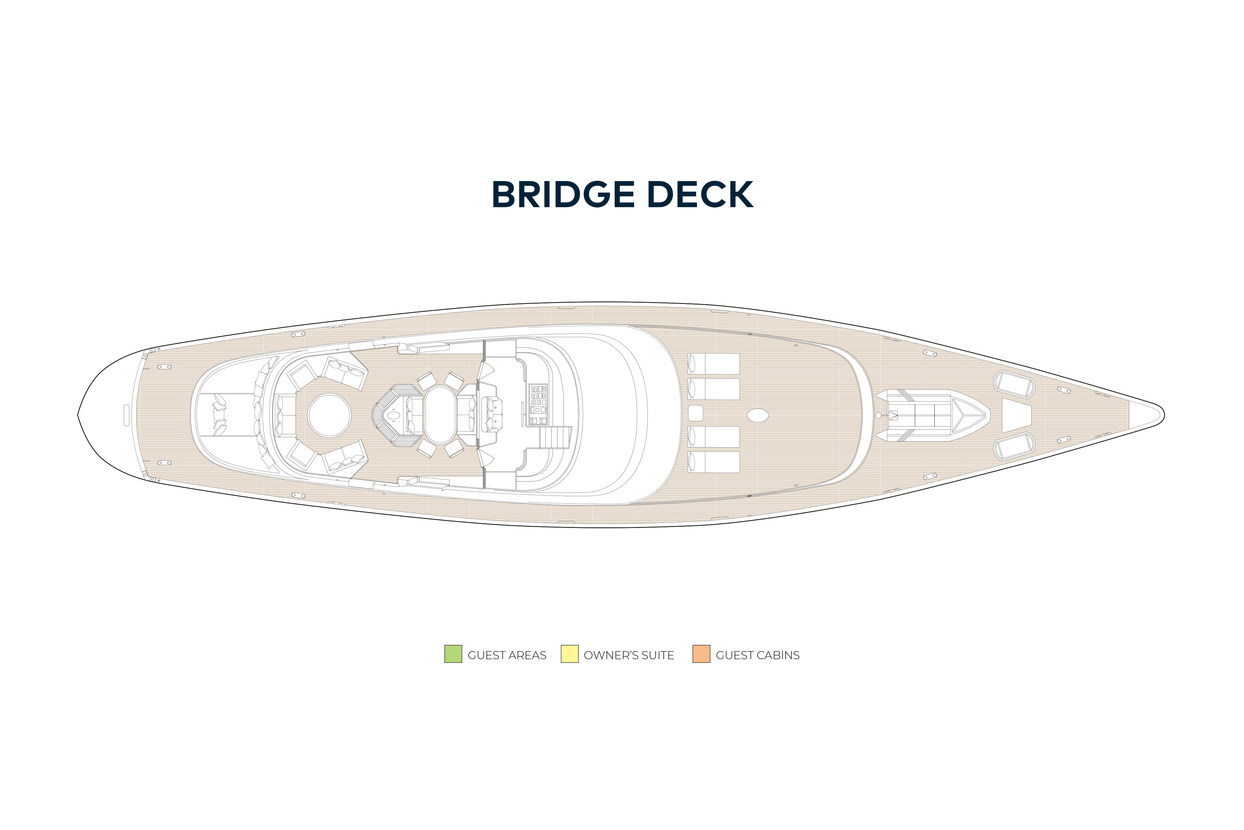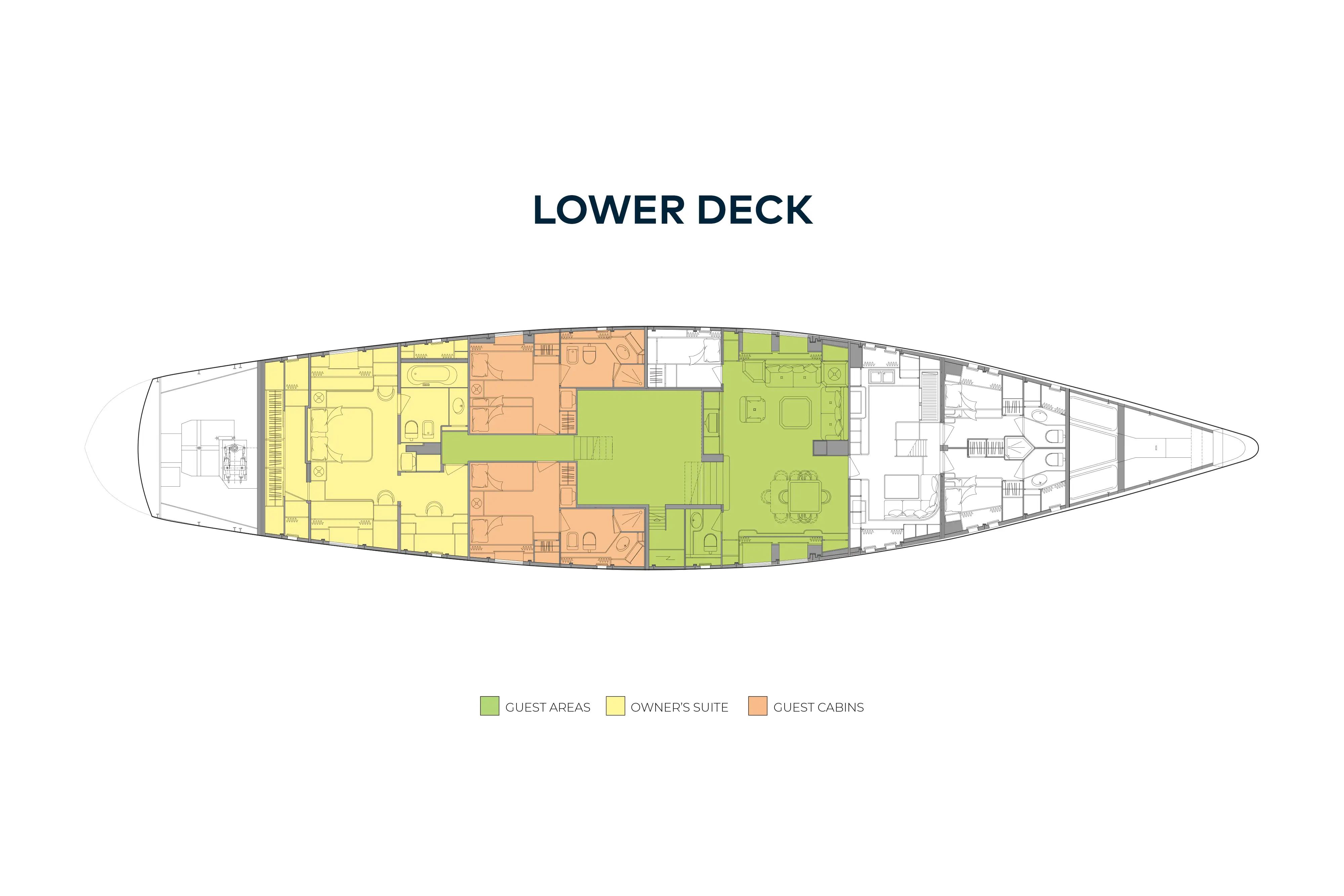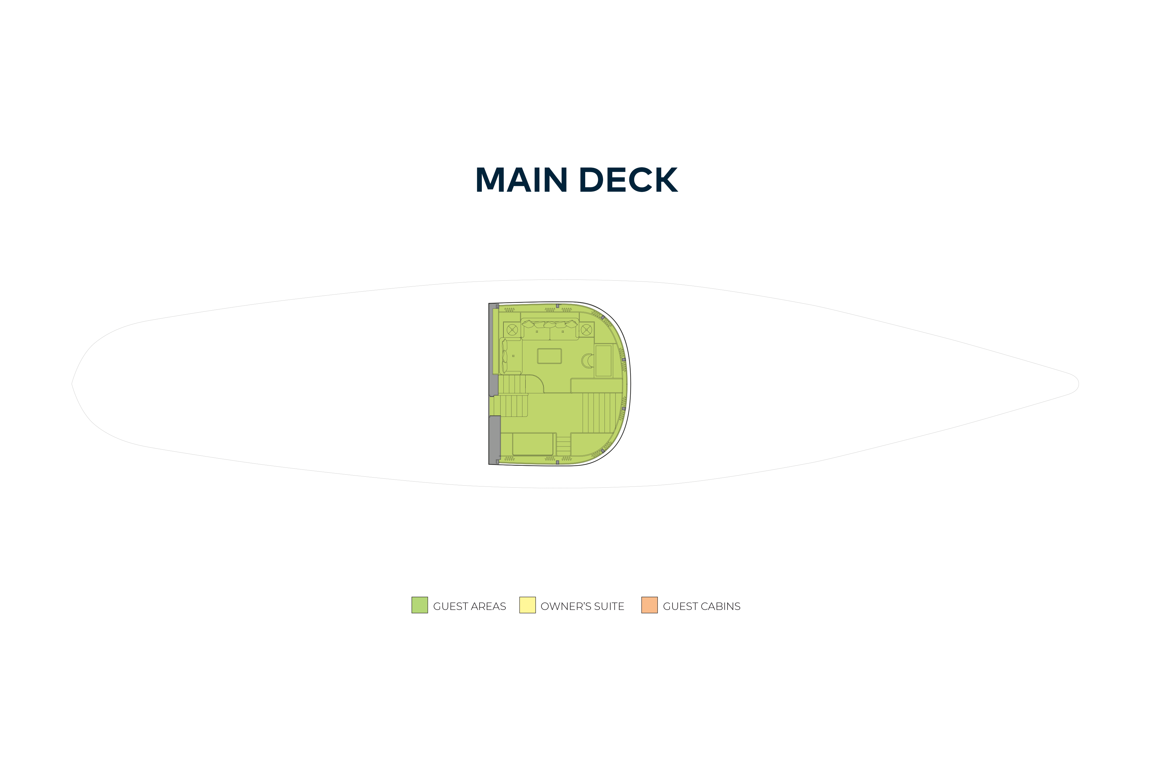 This yacht offers a family-friendly layout with accommodation for six guests. On the lower deck, the full-width private master stateroom is found aft. Here you find a generous, glamorous space with walk-in wardrobe, en suite bathroom with a full bath, plus a seperate study area. Next door are two twin cabins that sleep another four guests. There is no compromise in comfort, as each cabin comes with an en suite shower room. There is also the option of an additional pullman berth for an extra guest.