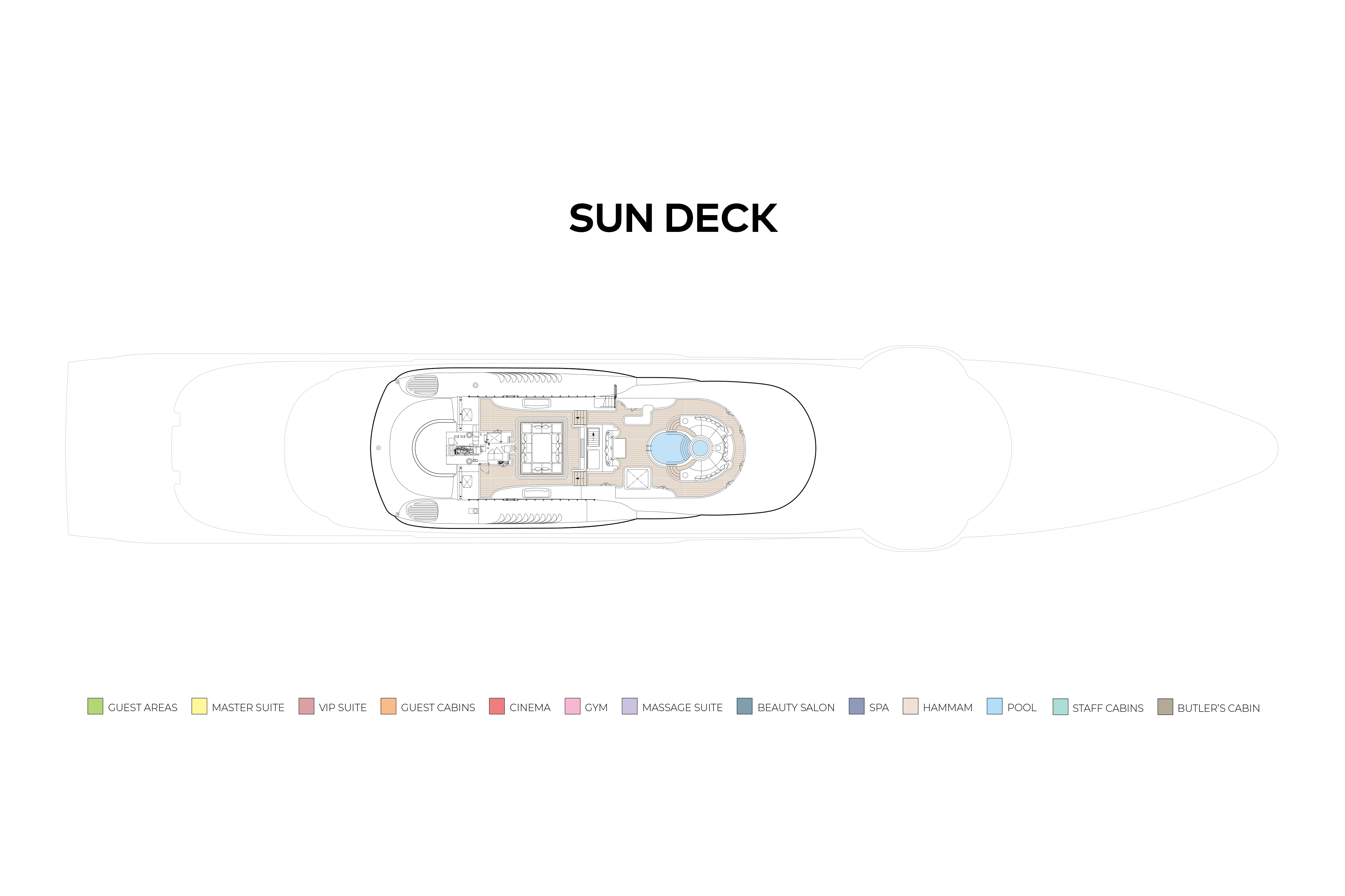 Exterior features include a sun deck with a large pool with counter-current jets and a jacuzzi, bar and open-air dining. There are no fewer than five balconies and sea terraces across main and lower decks, two of which serve the dining room and main saloon and another spectacularly opens up a lower deck guest cabin. There are helipads on the foredeck and forward on the owner’s deck where a companionway leads to a private terrace.