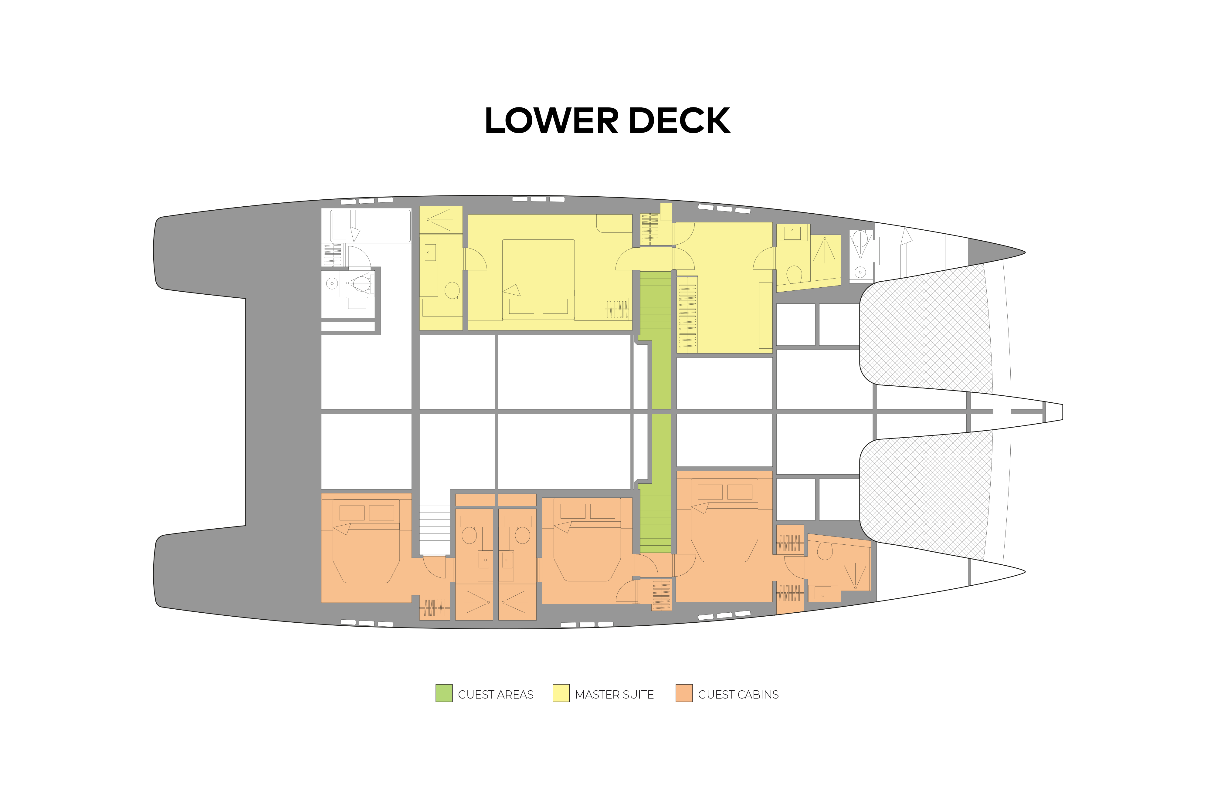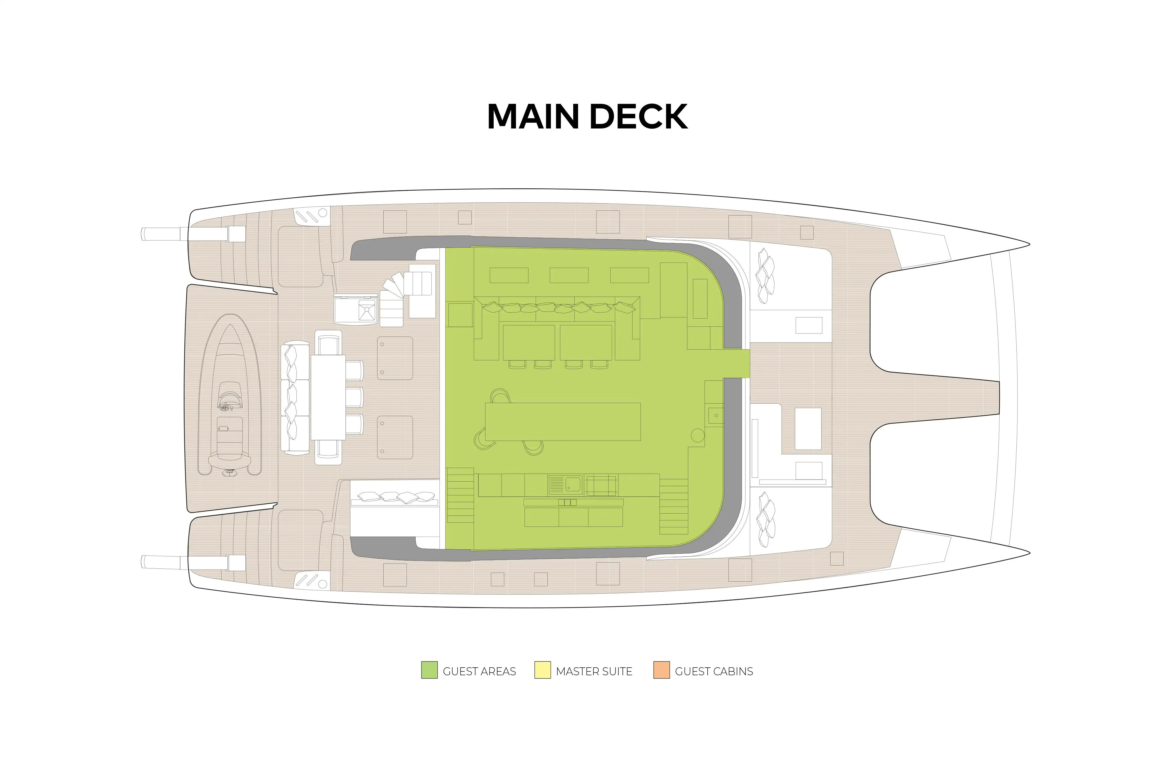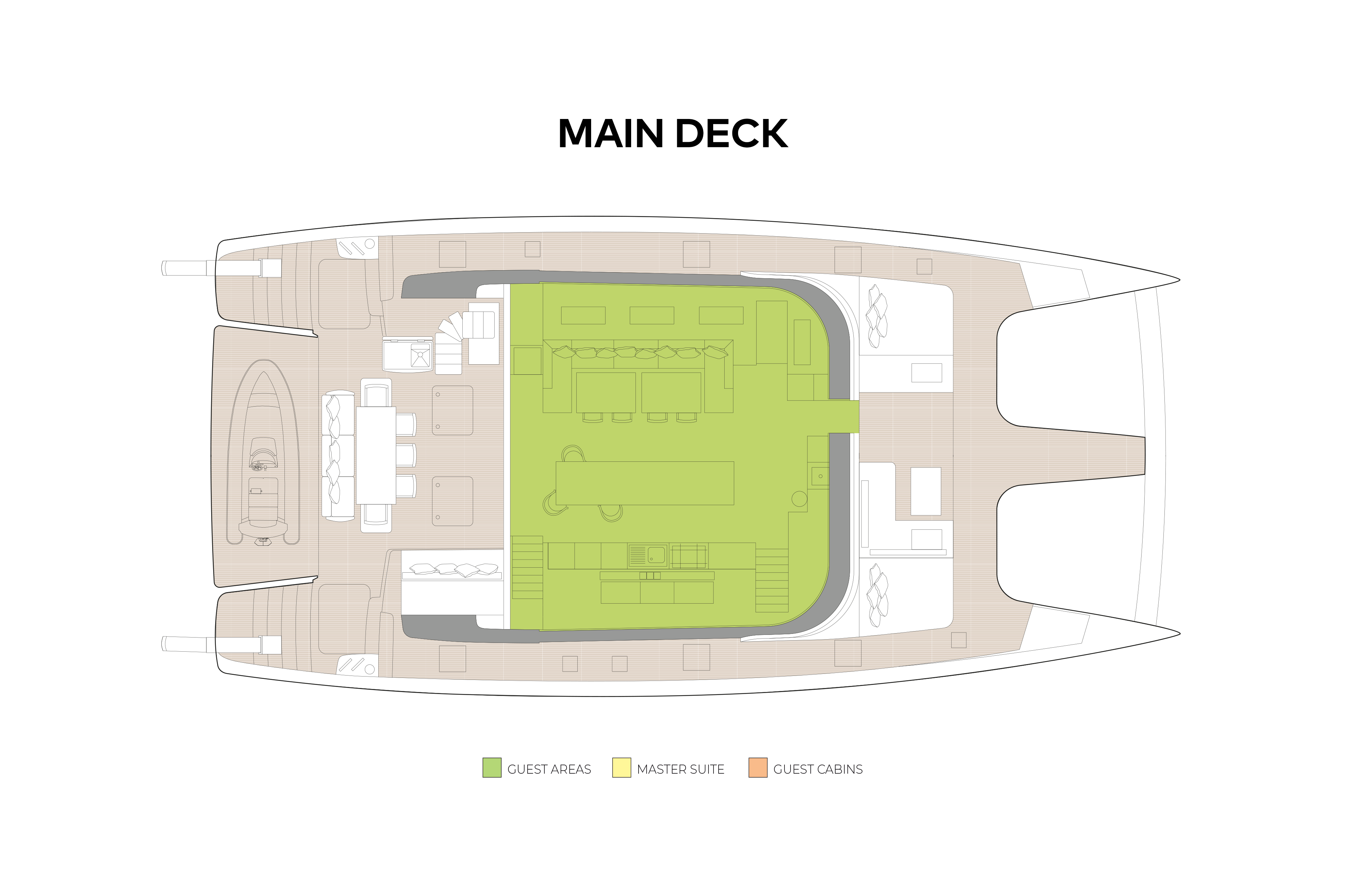 On the lower deck there are four suites for eight guests including an ‘owner’s hull’ to port with a king-sized double berth, his-and-hers bathrooms and a large walk-in wardrobe. Three large hull ports and deck hatches above the bedroom and en suite deliver views and natural light. There are two additional queen-sized double berths in the starboard hull and a third gym/guest cabin aft, all en suite and with similar natural light, along with accommodation for up to five crew.