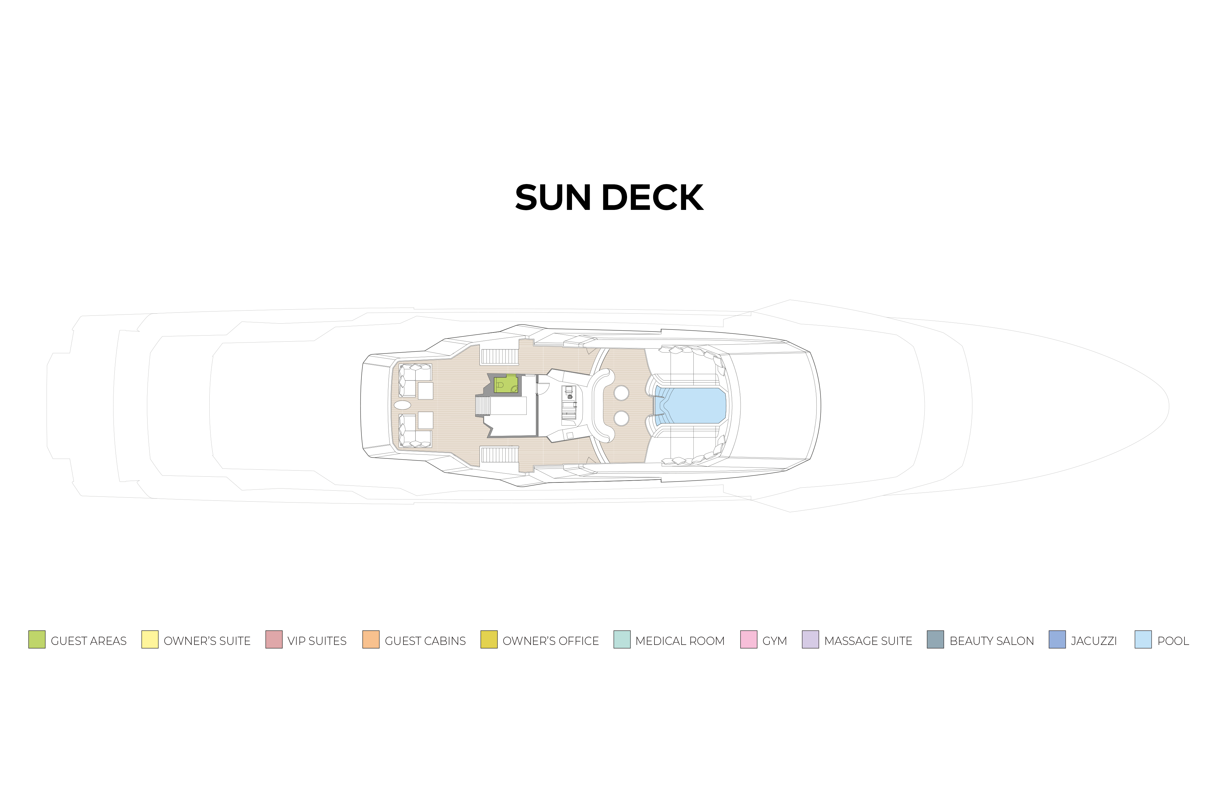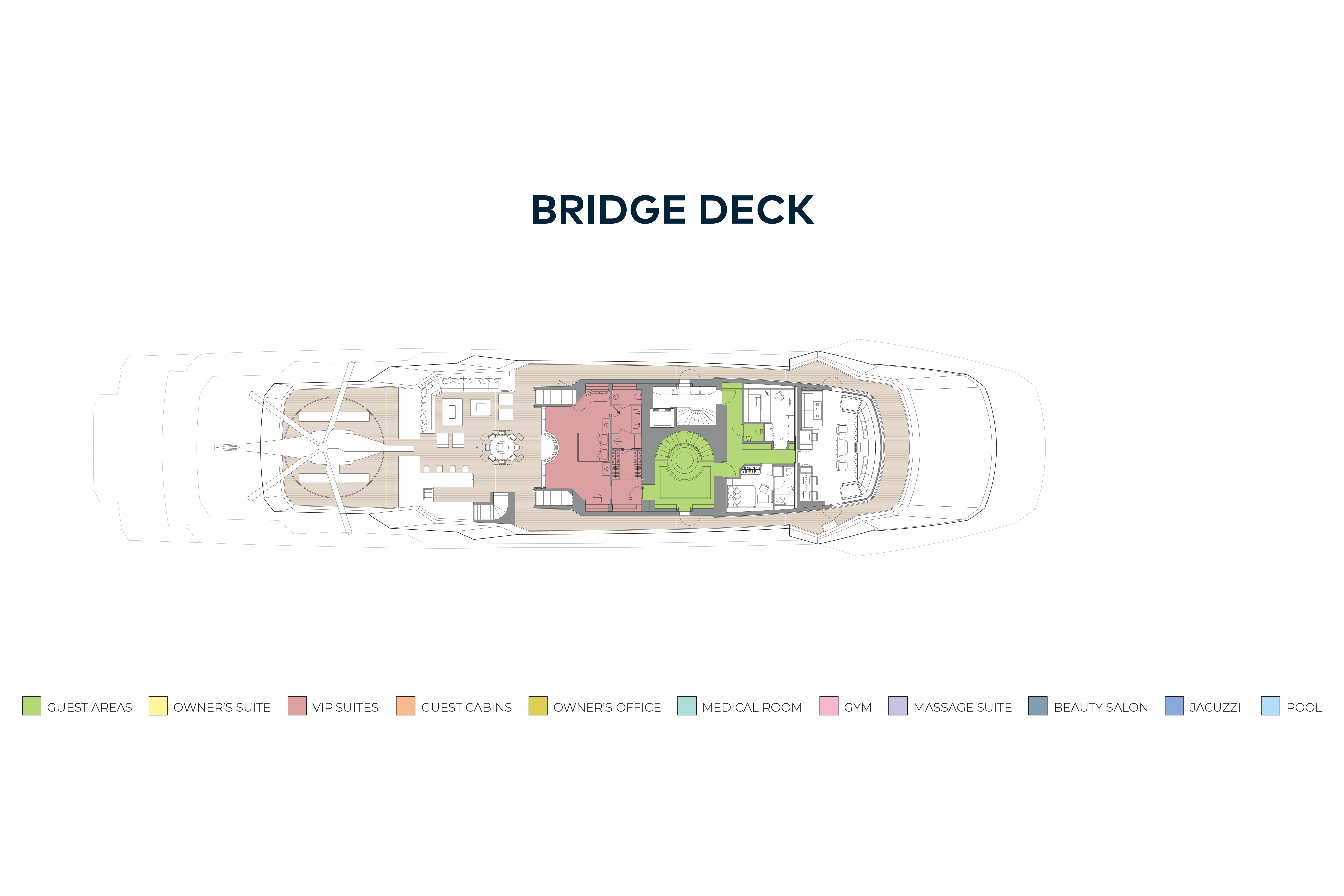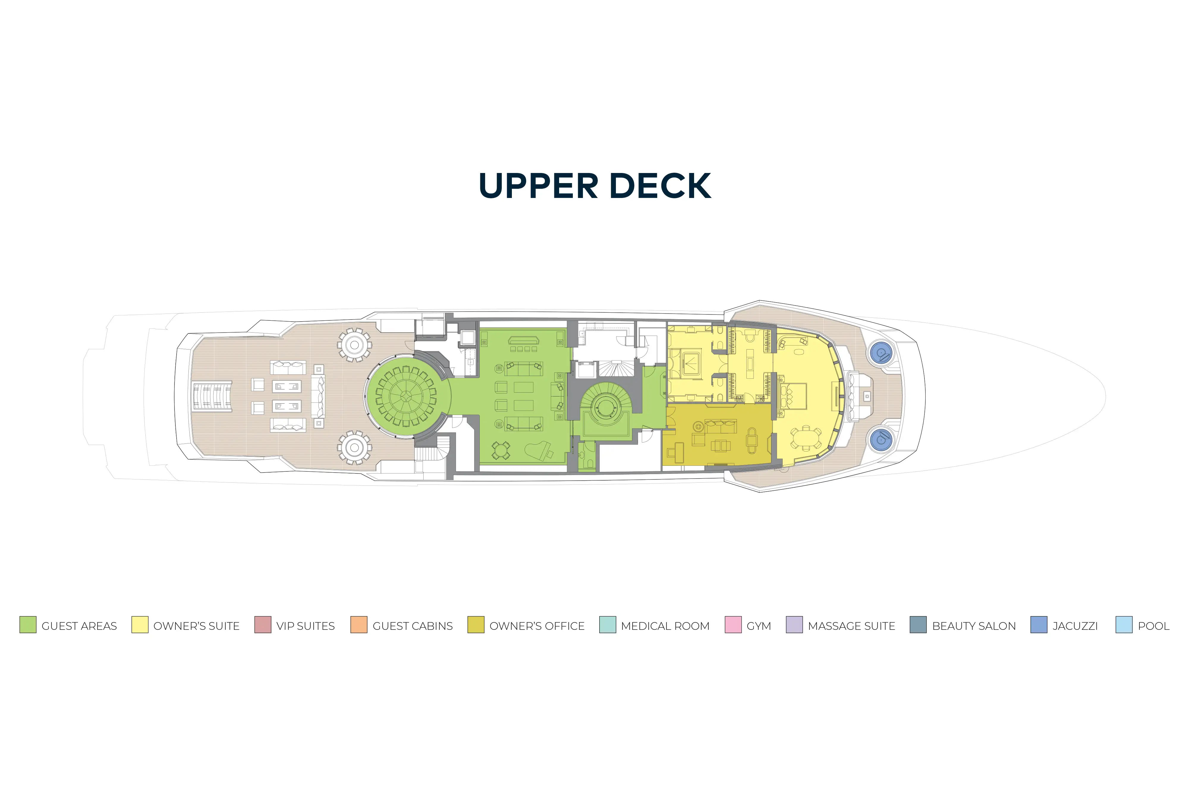 The upper deck has a VIP cabin, with en suite. A central staircase runs to the main deck aft where internal steps either side lead down to the swim platform, shower, dayhead and dressing room. The main deck is also walkaround and guests moving forward pass the boat deck where two 9.5m (31.2ft) tenders are launched on horizontal davits. There is also a full-beam tender and toy garage aft on the lower deck.