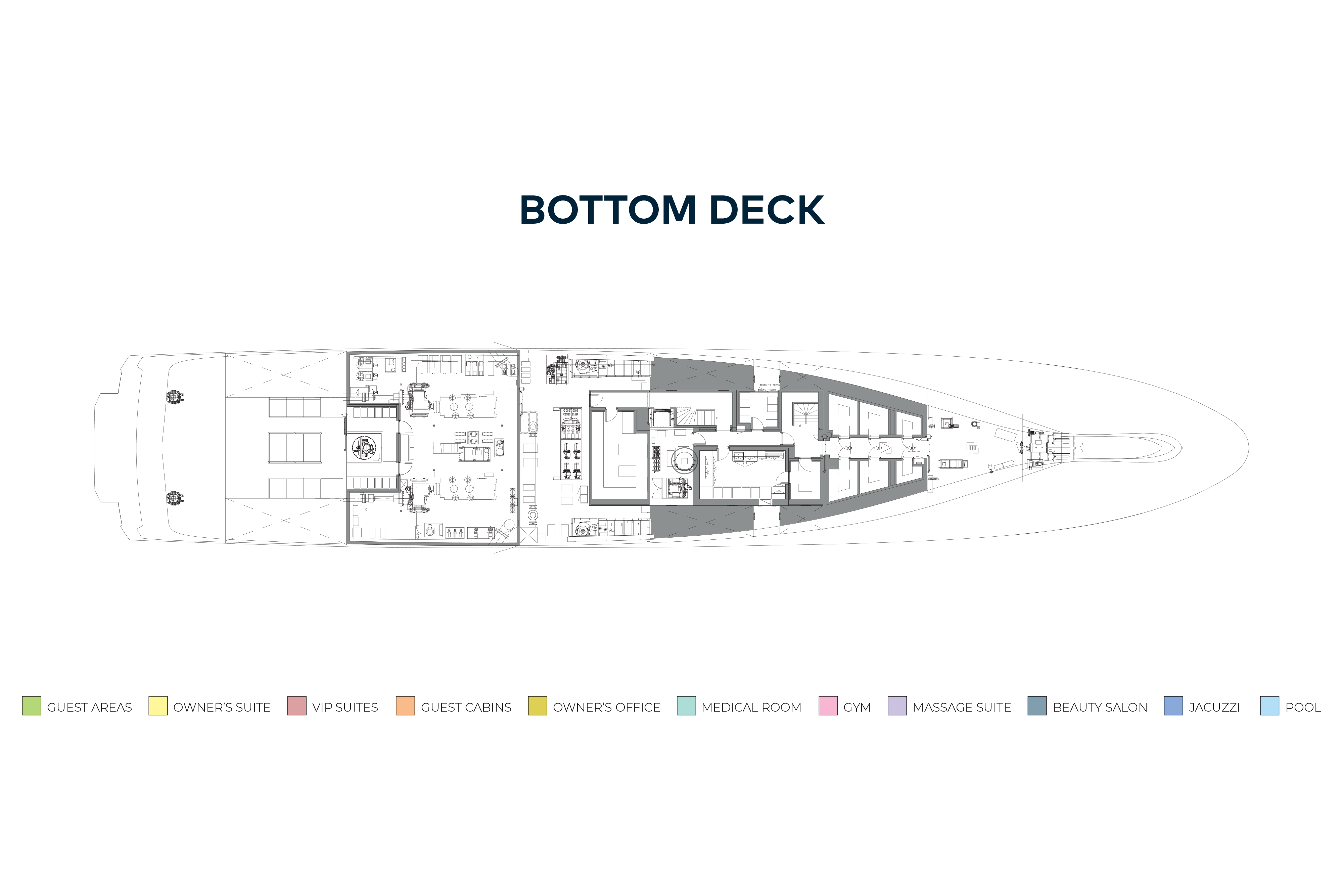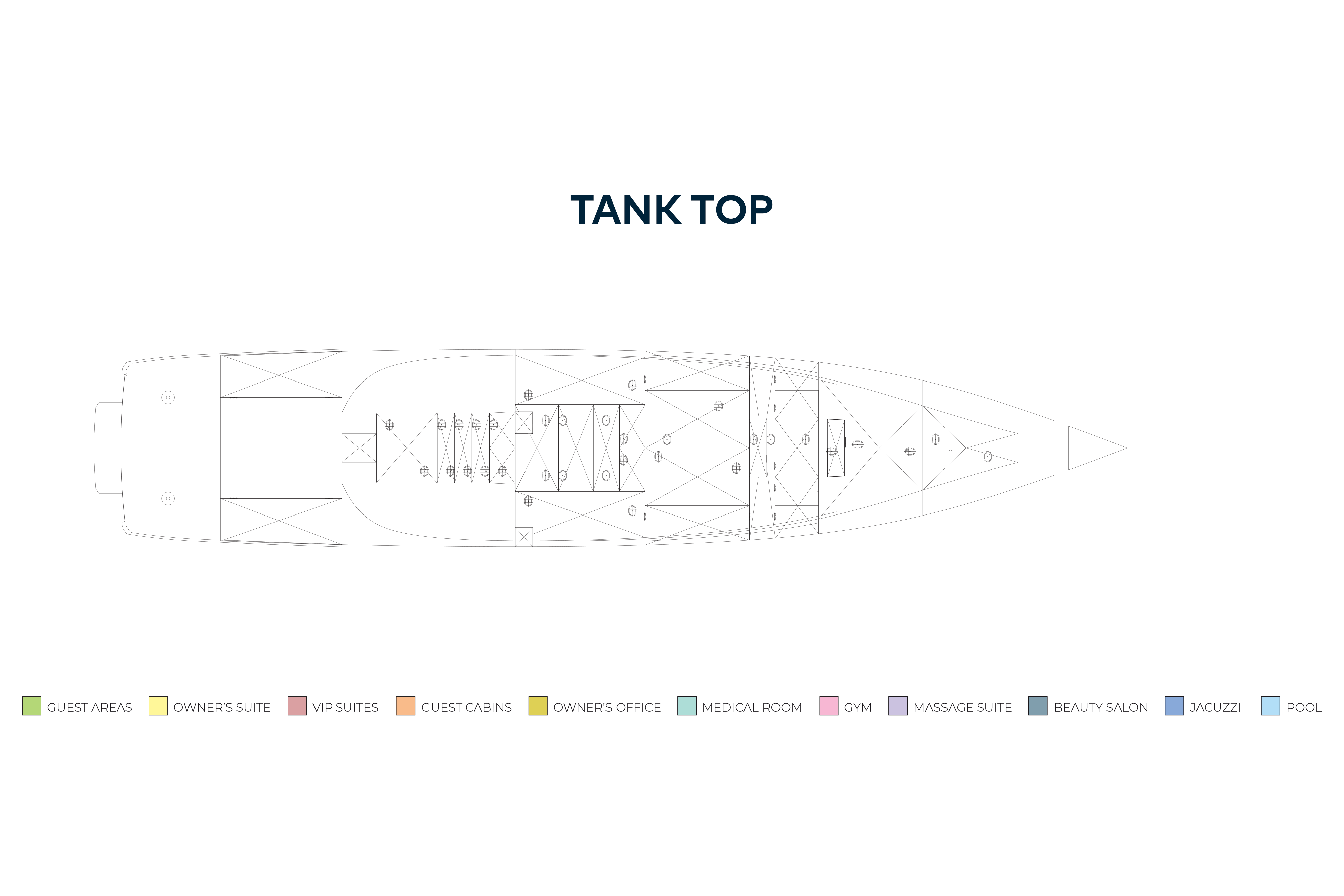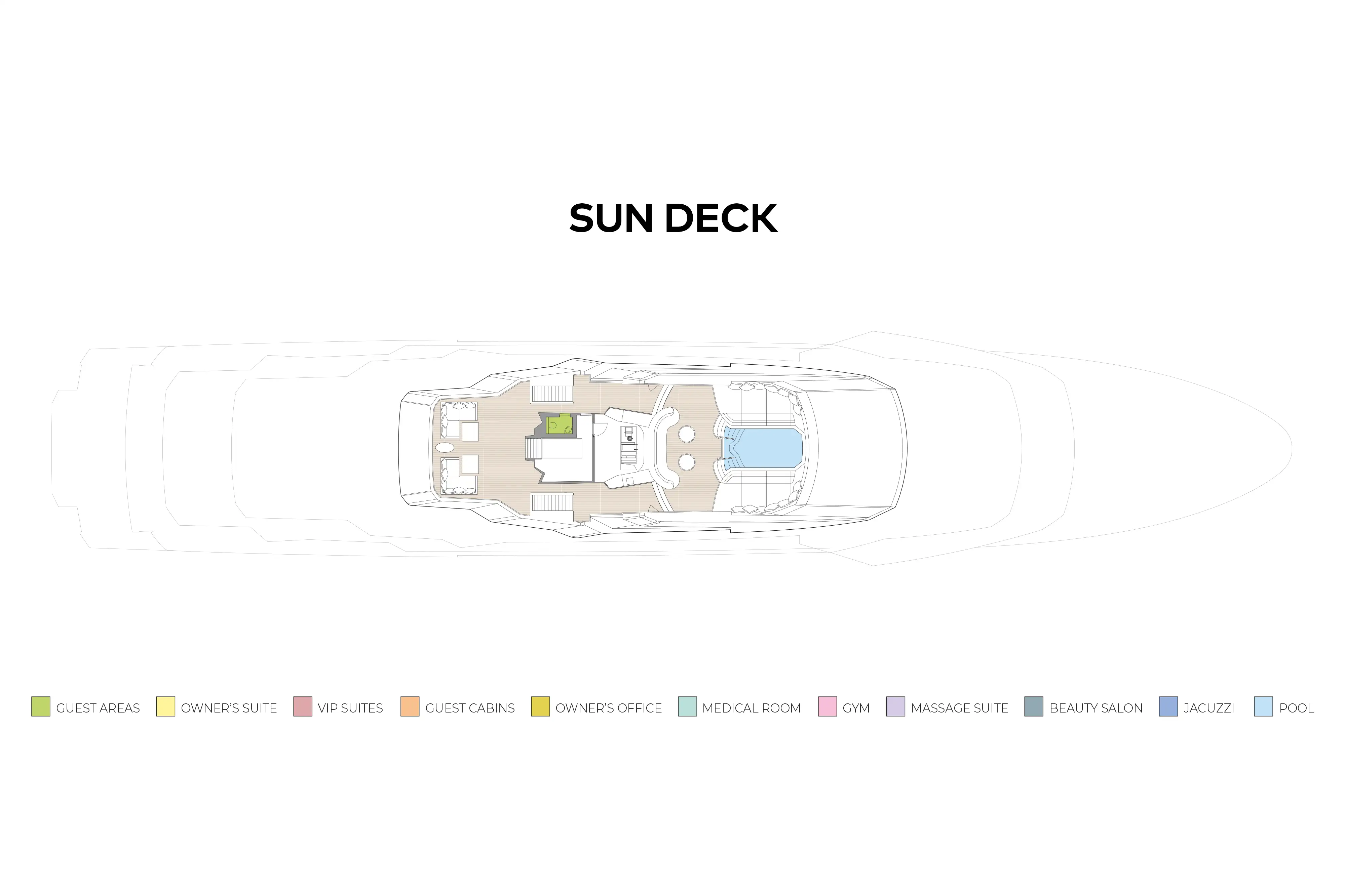 The upper deck has a VIP cabin, with en suite. A central staircase runs to the main deck aft where internal steps either side lead down to the swim platform, shower, dayhead and dressing room. The main deck is also walkaround and guests moving forward pass the boat deck where two 9.5m (31.2ft) tenders are launched on horizontal davits. There is also a full-beam tender and toy garage aft on the lower deck.