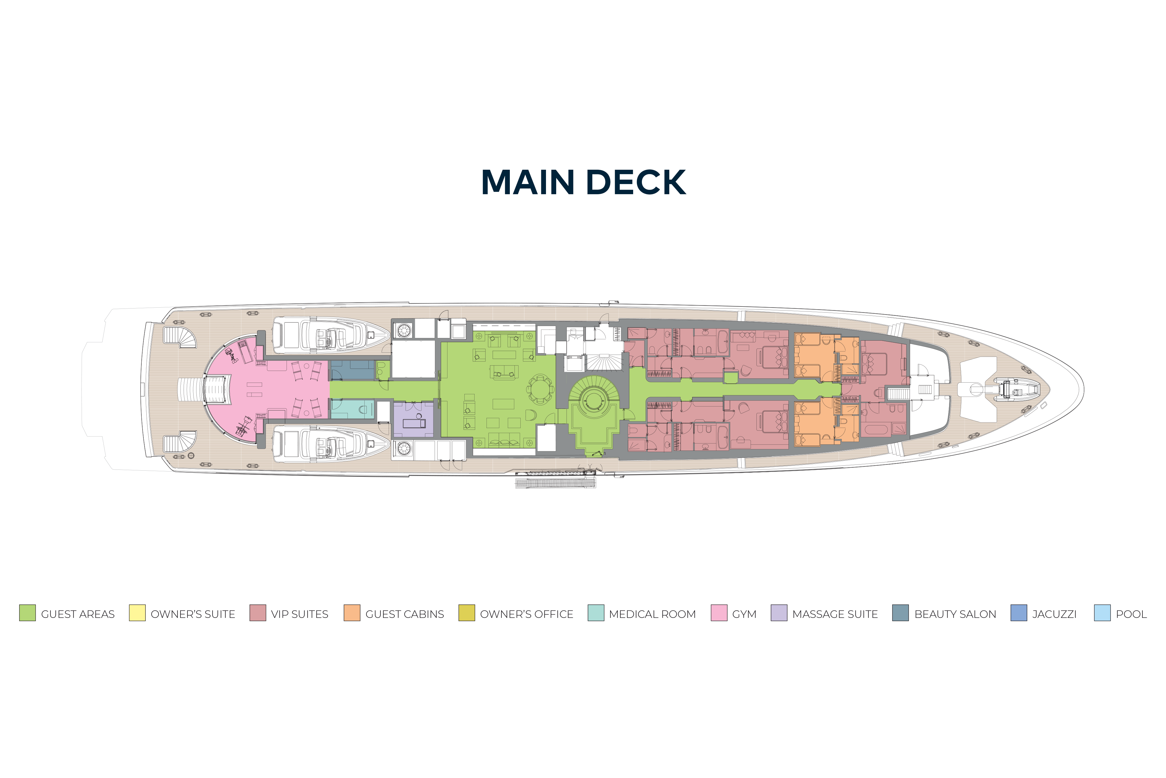 On the main deck there is a wellness spa featuring a gym with spectacular views aft through a semi-circle of sliding glass doors, buffet and bar, medical room, beauty salon, massage room and dayhead. An enormous main saloon features a variety of seating areas and doubles as a cinema with drop-down projector.