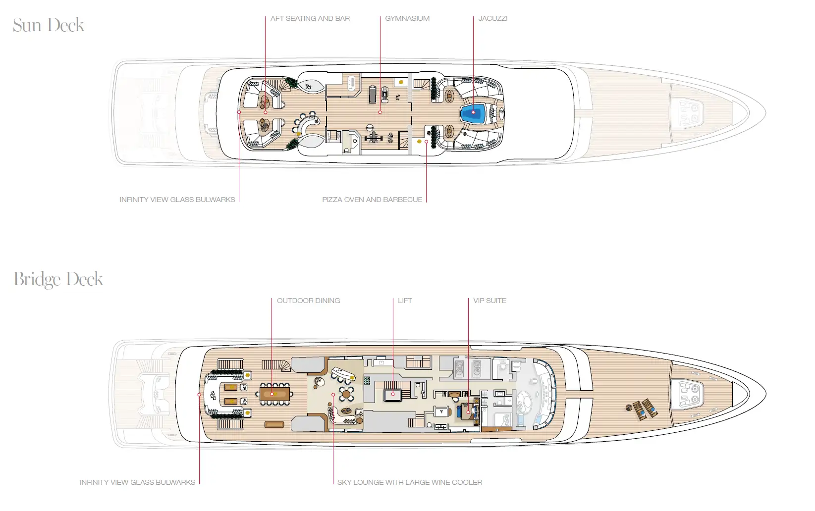 An ARROW yacht charter can accommodate 12 guests across six cabins, including a main deck master, a bridge deck VIP and three further doubles and a twin cabin on the lower deck. Charter guests will love her exquisite sun deck, with its partially transparent Jacuzzi with sunpads forward, pizza oven and barbecue area, gym – which can be either open or enclosed – a cool sit-up bar and lots of lounging options, including C-shaped sofas aft with more infinity views.
