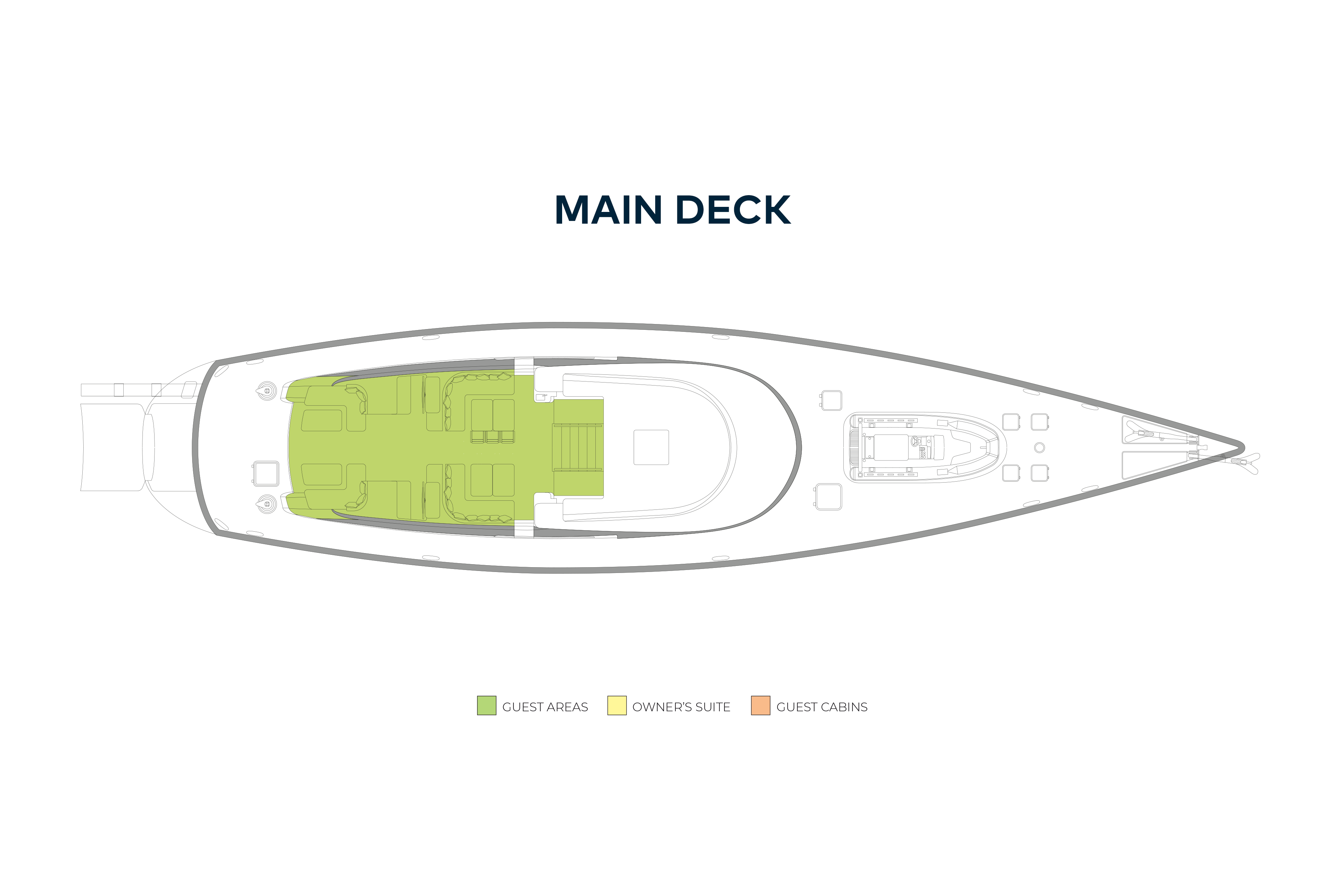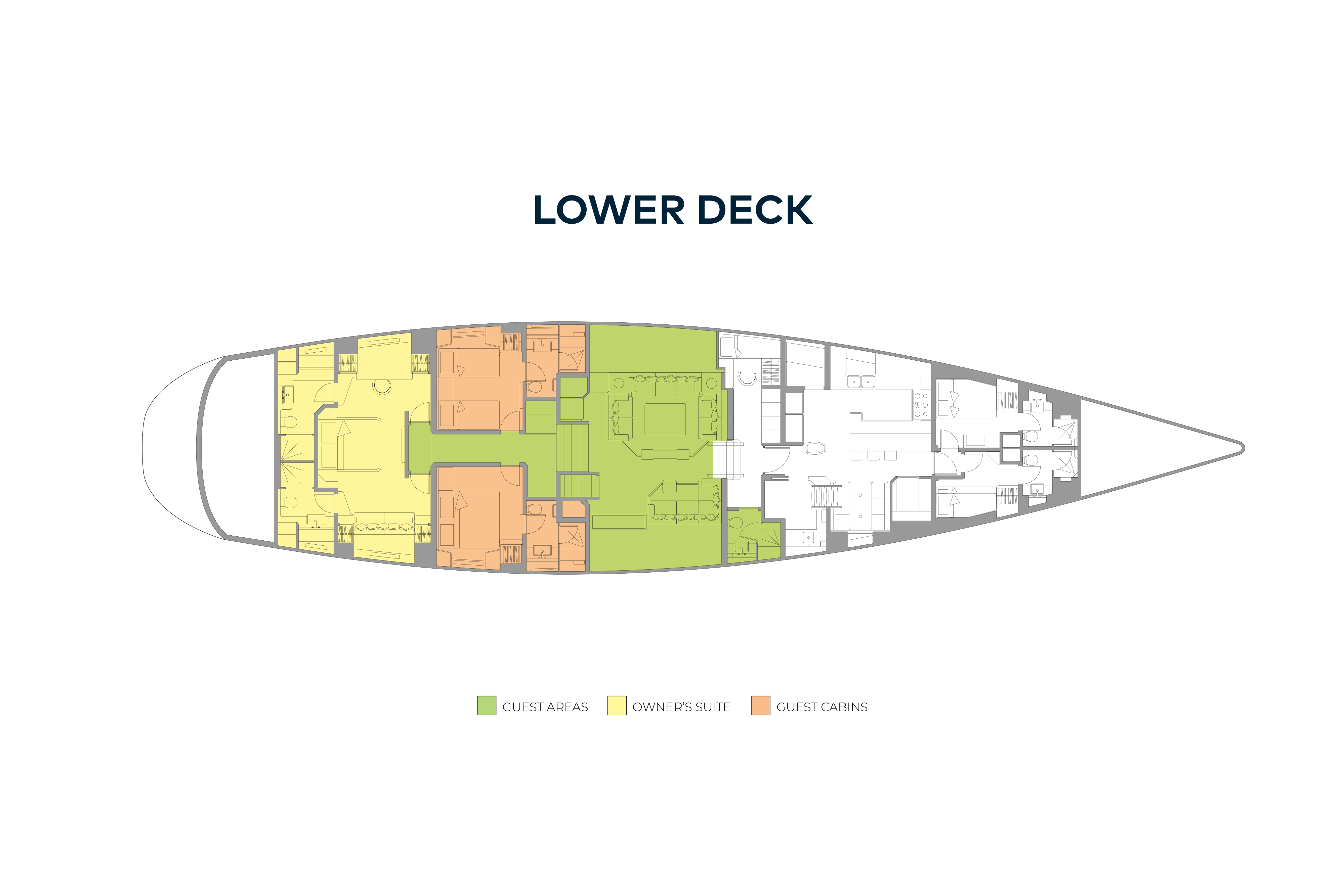 Ideal accommodation for six guests but possibility to accommodate 10 guests (with children). The full width master cabin can be divided into a smaller master cabin plus twin bunk cabin arrangement. The 'his and hers' en suite bathrooms in the master cabin in full cabin mode become an en suite for the master and an en suite for the bunk cabin when the partition is in place. The two double guest cabins can be converted to two twin cabins with pullmans.