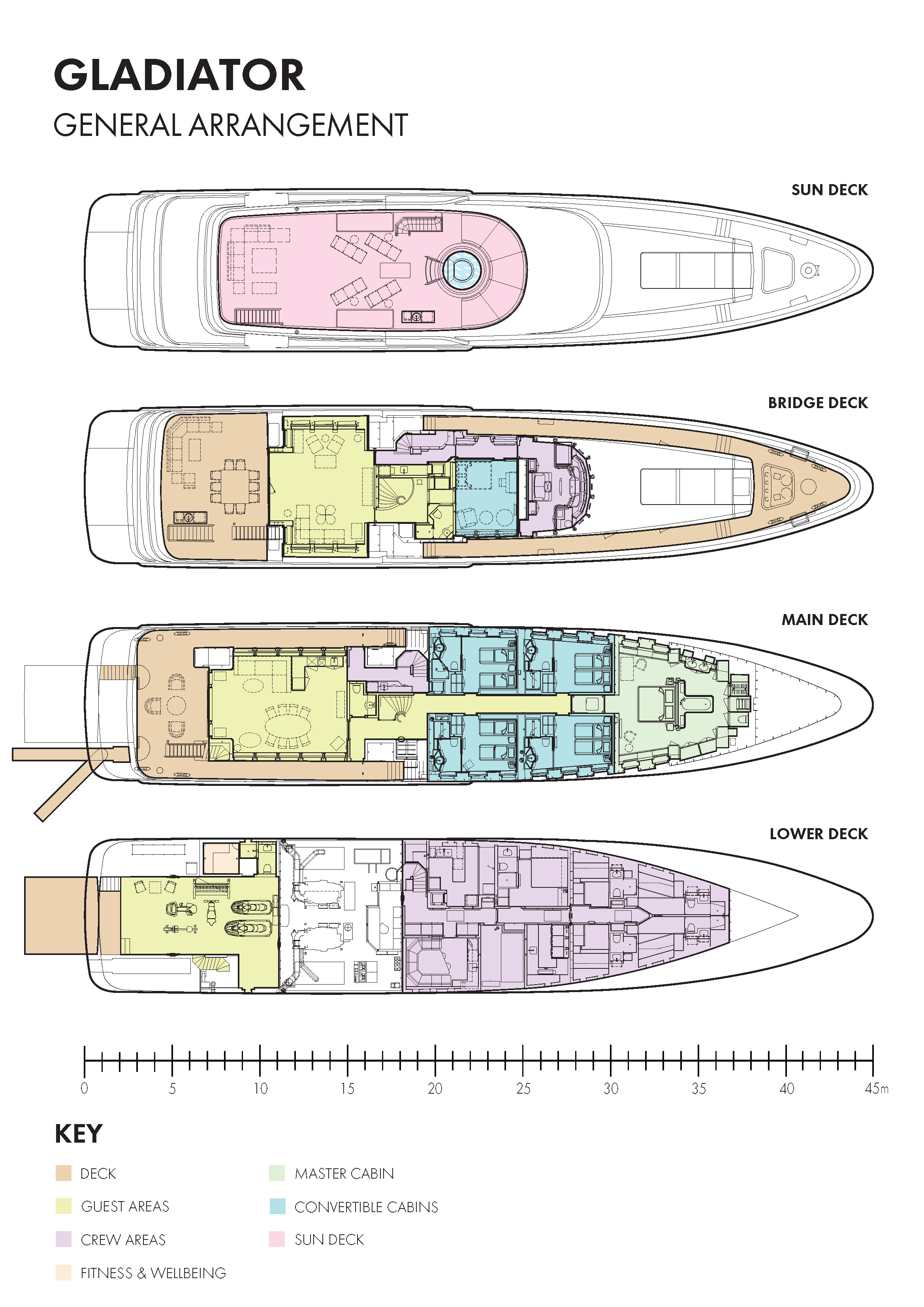 Fresh from a significant refit in 2021-22, GLADIATOR has every element needed for an unforgettable charter experience. From her expansive sea-level living spaces and 14.6m (48ft) chase tender to a professional crew including an exceptionally talented chef that each deliver a seamless service, choose GLADIATOR for the ultimate getaway.