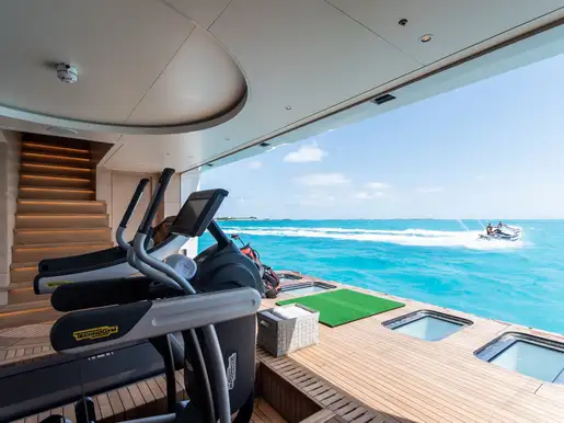 The exterior spaces are designed to maximise guest enjoyability, with copious comfortable seating options, spacious deck spaces offering both shade and sun, and exceptionally easy access to the water and water toys with a stunning beach club. The sun deck pool, surrounded by sun beds for ultimate relaxation, is a highlight for all guests. The sun deck also includes a bar, so a cocktail is easily delivered to guests enjoying the sun set on the horizon, and a shaded dining area as to enjoy an extravagant lunch with respite from the suns rays. The bridge deck aft is complete with a large dining table, surrounded by views of the paradise around you, and with space for all your guests to enjoy meals together. The beach club offers an exceptional crescent couch to sit back, relax, and take in the action while those more adventurous dive in the blue water, take the jet skis for a spin, climb on the floating inflatable tower, and anything else you might dream up. If you're not exhausted from water sports and a day spent in the sun, there is also a gym in the beach club, complete with a treadmill, elliptical, and weights.