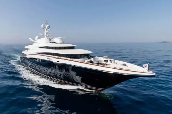 WHEELS is an absolute show stopper of a yacht. With 360 views from the crow's nest's day bed and bar stools, you can see the sun deck pool forward and the jacuzzi aft, both flanked by sunpads. Between them is a huge expanse of versatile deck space for yoga, open air massage, sun lounging, al fresco dining or entertainment and a fully equipped climate controlled gym for morning workouts.