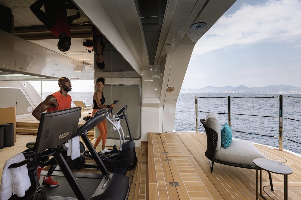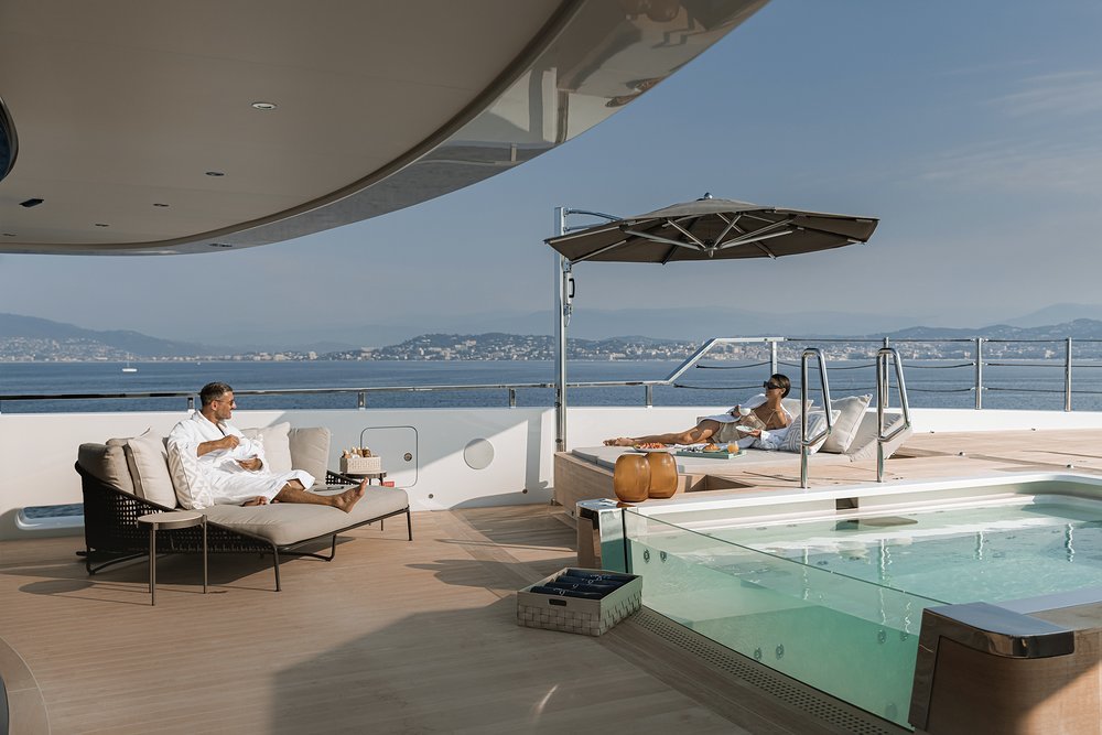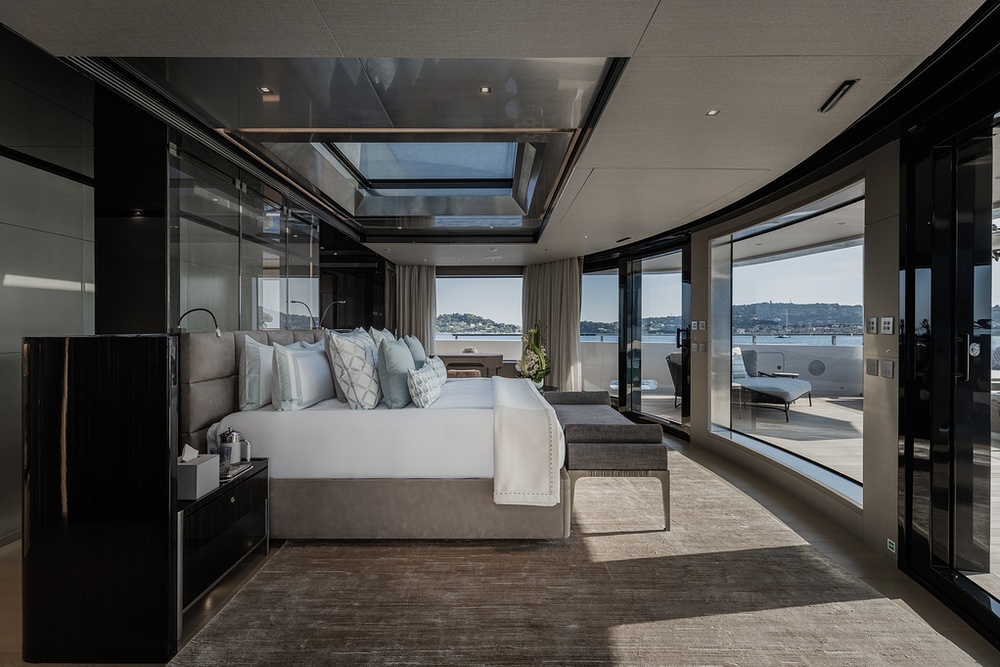 A rarity for yachts of this length, CLOUD 9 has an expansive owner’s suite offering panoramic views through sliding doors that lead onto a private terrace that has its own jacuzzi pool and flanking sun pads. The versatile flush exterior deck provides unobstructed views across the bow, resulting in a clean and sleek aesthetic for a peaceful ambience; just perfect for sunrise yoga or a romantic dinner for two. Inside, the owner’s suite features a bedroom with floor-to-ceiling glazing, his and hers dedicated bathrooms, a walk in wardrobe and a private study.