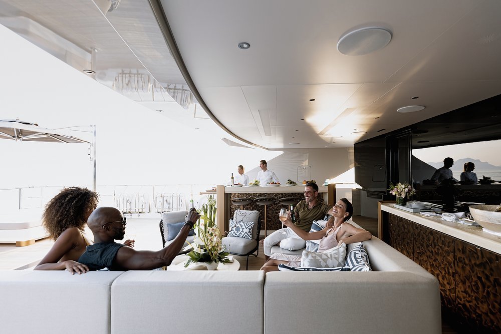 CLOUD 9 has one of the most outstanding beach clubs in her category. Illuminated by shimmering light from the glass bottomed jacuzzi pool overhead, the space opens directly onto the seascape on three sides via the two fold down balconies and transom. There is a sit up bar and lounge area for indoor relaxation, and plenty of options for sunning on the balconies and swim platform, each providing access to the water via the three swim ladders. After an energetic morning on the yacht’s watertoys, hit the beach club bar for refreshments then rinse off in the shower and chill out in the hammam before lunch.