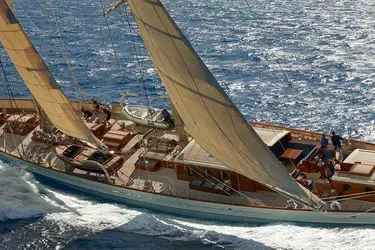 In common with all Alden designs, her sail plan is easily managed by a shorthanded crew but she can also pick up her skirts and fly at speeds into the high teens with a full crew in a regatta. When becalmed her 1,057hp MTU diesel engine gives her a top speed of 12.5 knots and a range of 3,200nm at her cruising speed of 10 knots.