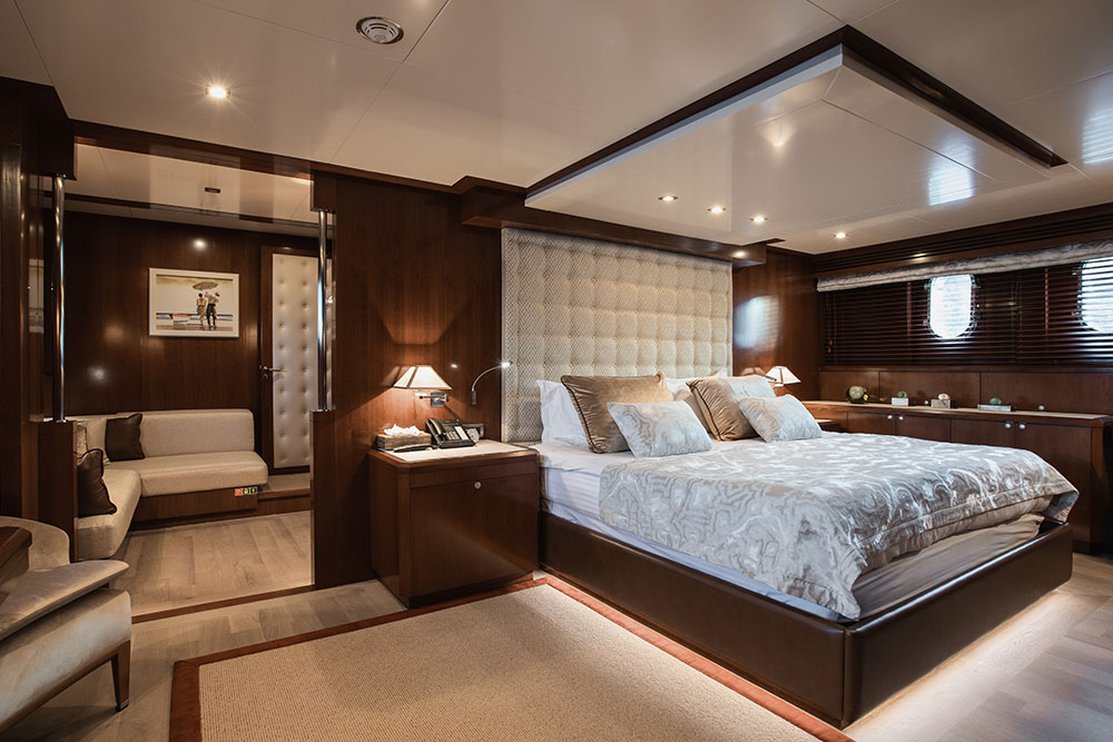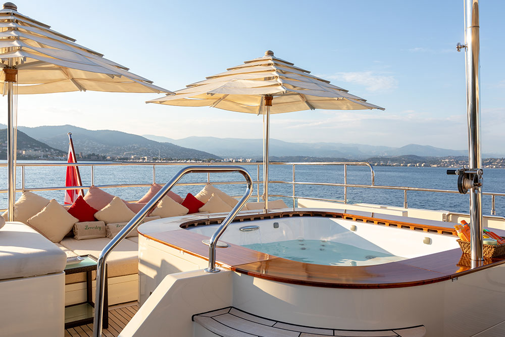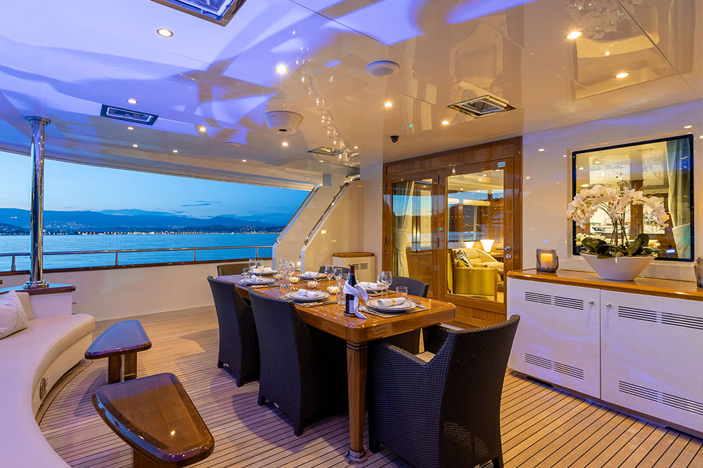 This yacht is set up for fun! The huge sun deck with bar, BBQ, jacuzzi and steam room; all-weather open air dining on the main deck aft, with a bar just inside for entertaining; high-tech TV and sound system for movie nights. We can organise a party in no time, themed evenings for special events, birthdays, and even weddings.