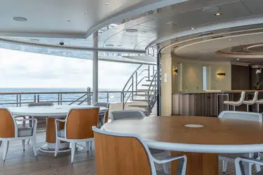 'Planning a celebration? After getting some treatments in the main deck beauty salon, take the elevator to the upper deck where there is dining inside, surrounded by sliding glass doors, and outside, so there are fantastic views whatever the weather. If you want to turn up the music, there's a full-beam entertainment lounge inside, or relax for a moment in the outside lounge. The next morning maybe you want to workout? Head down to the fabulous gym on the main deck with sliding glass doors so you get the sights and sounds of the ocean.
