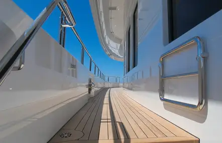 ‘When it comes to performance and sailing experience, you won’t be disappointed,’ says Baynes. ‘She has twin-screw diesel engines that turn out an easy cruising speed 13.5 knots, top speed of 16 knots and range of 5,000nm. At anchor her Quantum zero speed stabilisers act to stop any wave action – so you and your guests can focus on what is important, enjoying yourselves.’