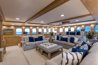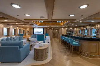 Outside she looks utterly immaculate following a full repaint, all brightwork revarnished, teak decks sanded and recaulked. Inside the great Laura Pomponi has brought her Luxury Projects team to bear with new handmade carpets throughout and a new hardwood floor in the sky lounge, new soft furnishings and fabrics, new sofas in the main guest areas and a scattering of new artworks.