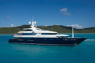 This luxury superyacht features a forward-facing jacuzzi and custom-built glass doors that shield guests from the elements on the sun deck. Accommodation for 12 guests is made up of a master suite, three double and two twin cabins, all with en suite bathrooms.