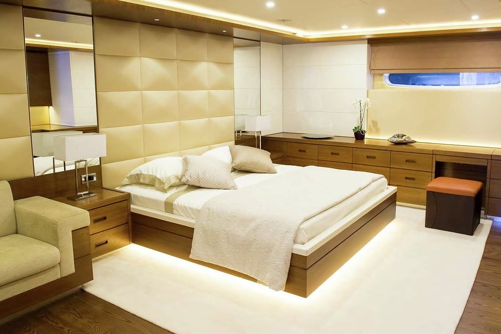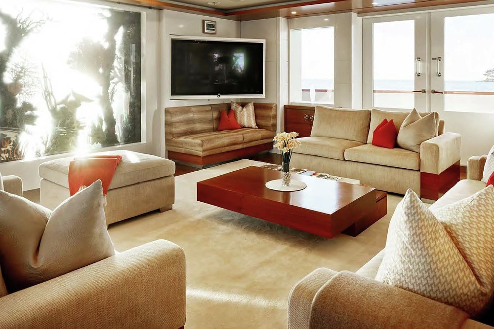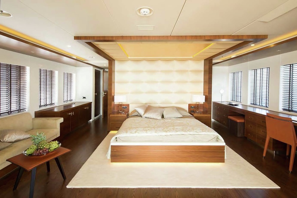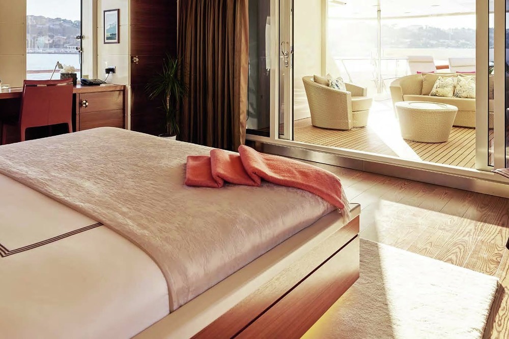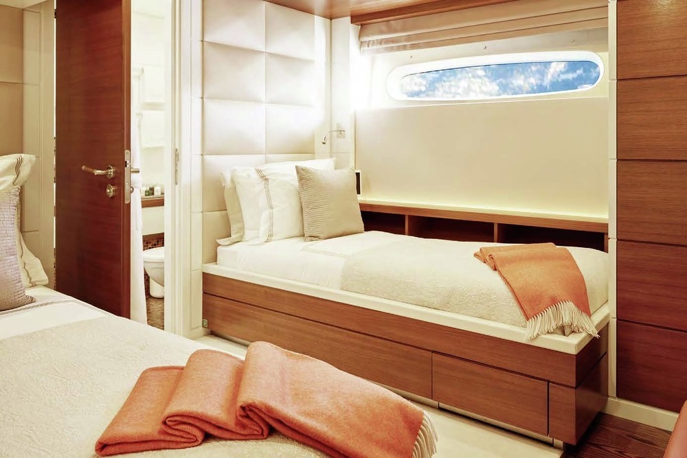 ‘One of the ways that GHOST III suits a big group is the way the cabins are laid out. There are two main suites, one on the bridge deck and one on the lower deck. The advantage of the bridge deck master is that you have the option to make the whole deck private. The advantage of the lower deck VIP suite is that the children’s cabins are at hand on the same level. Plus there are two more cabins that can be either twins or doubles, as you prefer. In all there are six cabins and many ways to make everyone feel at home.’