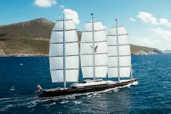 MALTESE FALCON is instantly recognisable due to her three free-standing carbon fibre masts, each with six fixed, curved yards along which 2,400sqm (25,833sqft) of sails rolled in the mast unfurl in under six minutes.